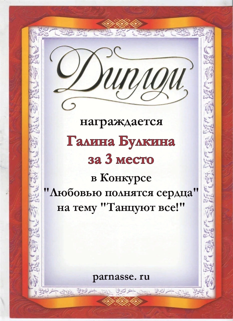 За 3 место в Конкурсе "Любовью полнятся сердца" на тему "Танцуют все!"
