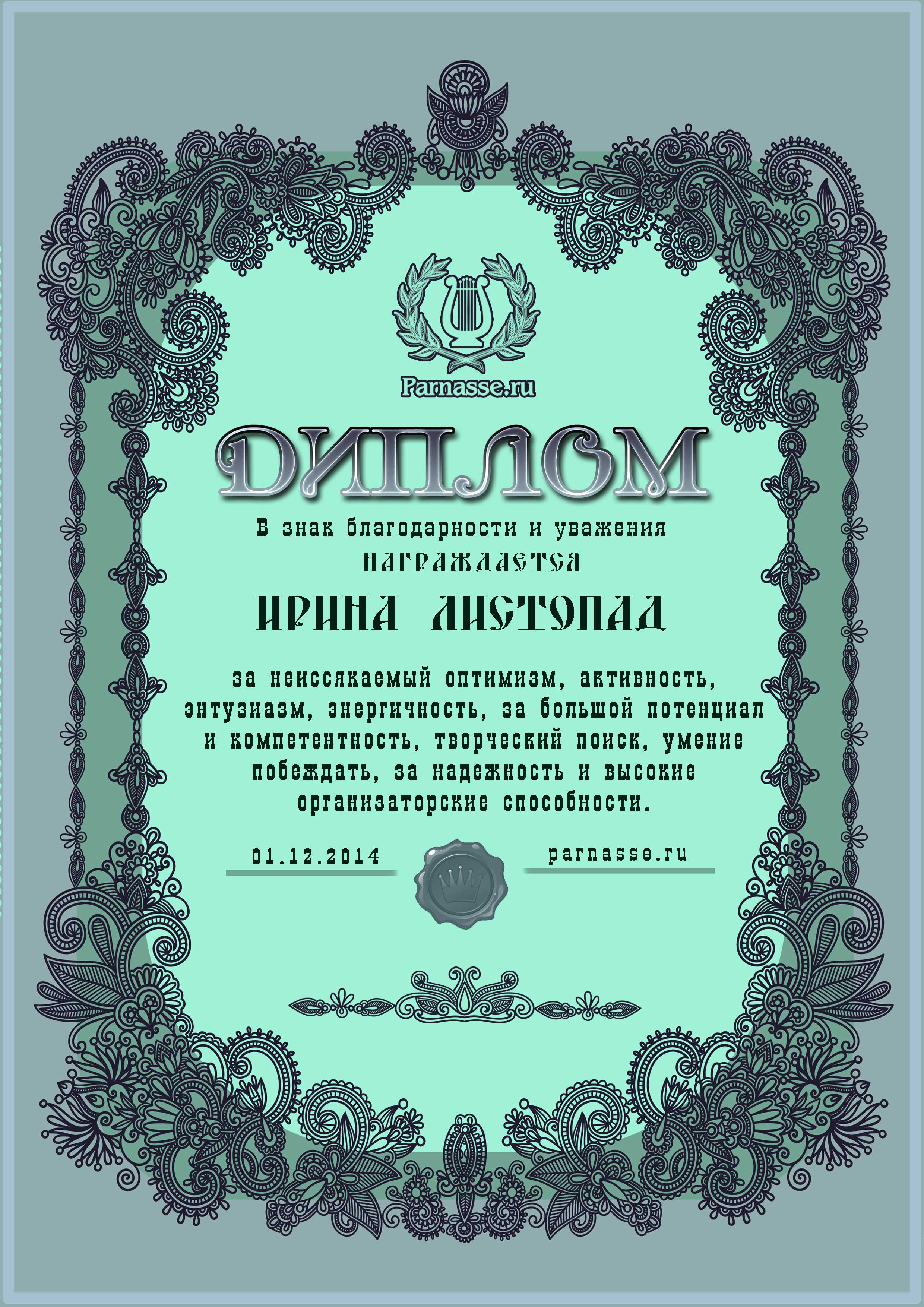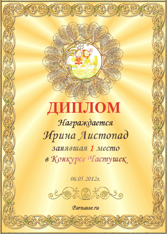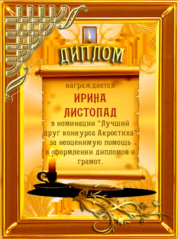 Диплом в 1 годовом итоговом конкурсе АКРОСТИХА в номинации "Лучший друг конкурса" (за неоценимую помощь в оформлении дипломов и грамот!ПОЗДРАВЛЯЮ!