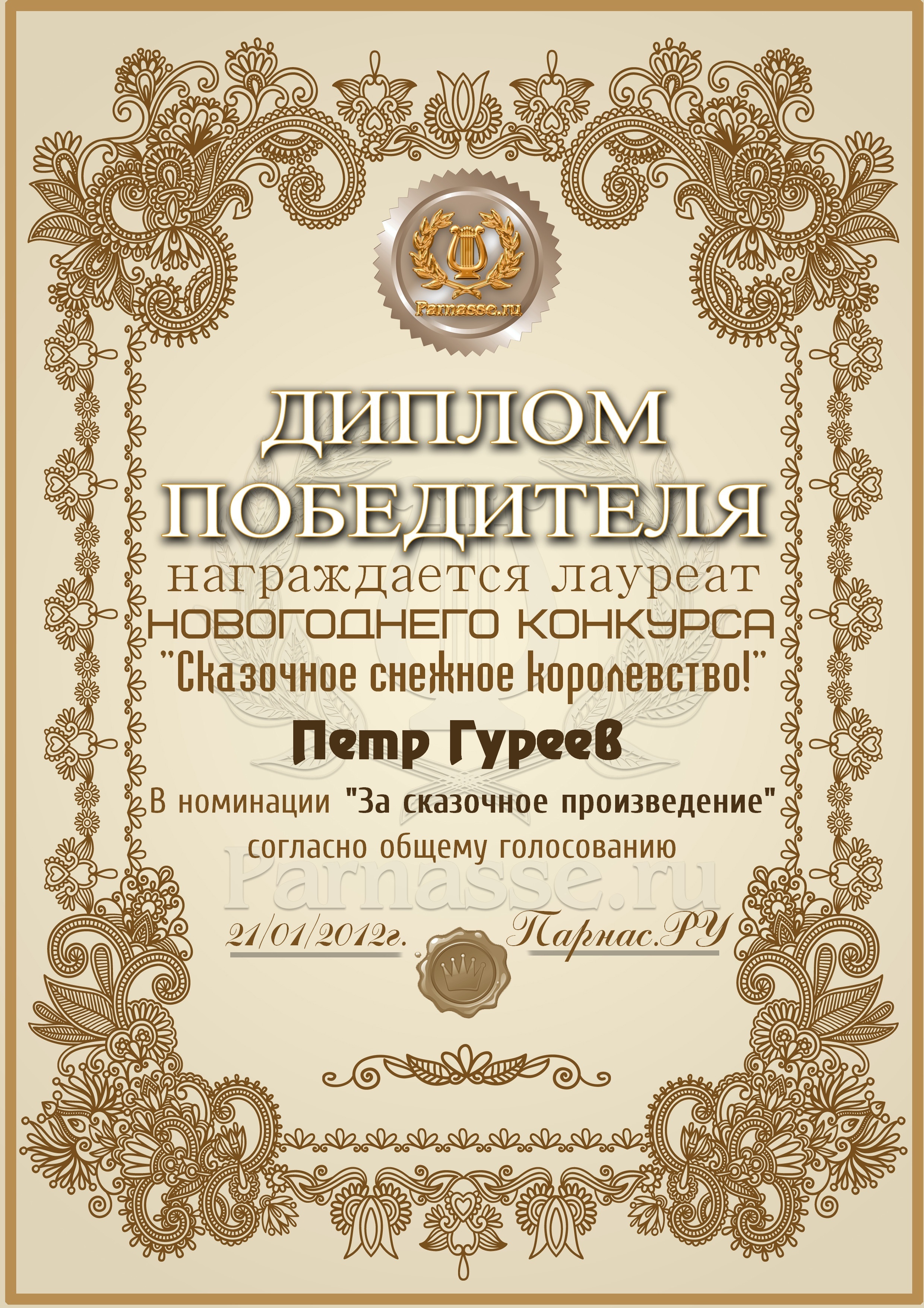 От лица Администрации творческого портала "Парнас" вручаем Вам этот памятный знак с самыми наилучшими пожеланиями! Пусть Вас весь год не покидает творческий запал, удача, а здоровье будет столь же крепким и нерушимым, как и традиция Новогоднего праздника! Счастья, успехов и любви Вам и Вашей семье, друзьям и близким!
