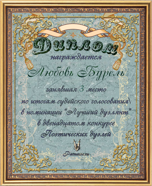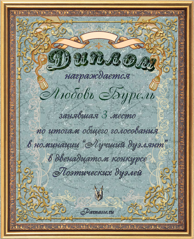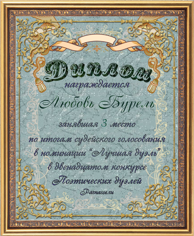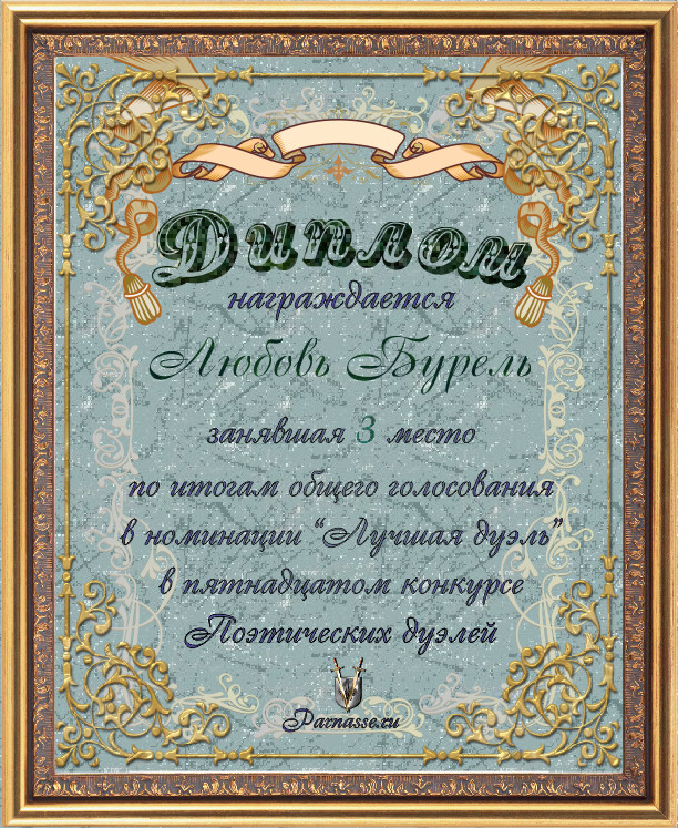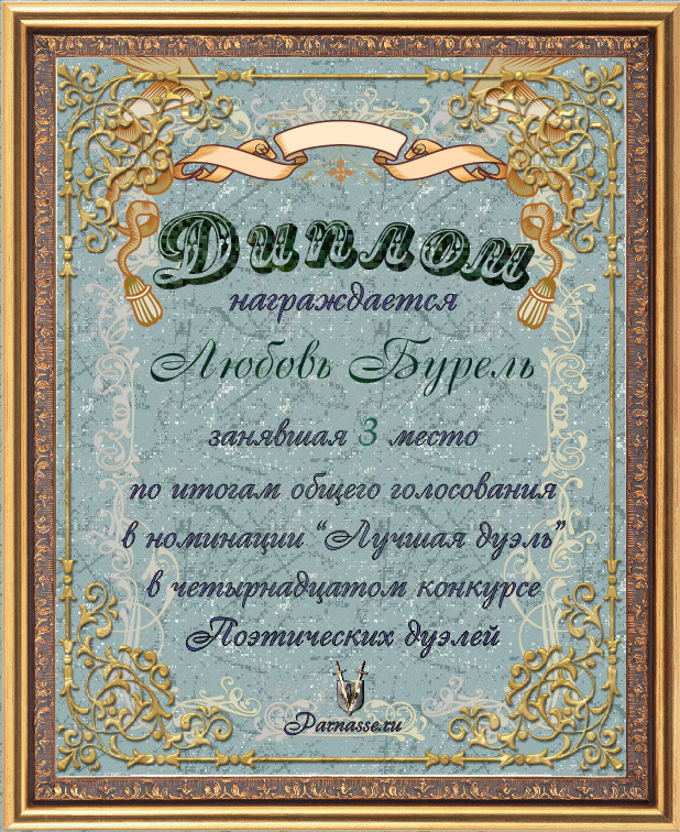 Диплом за 3-е место в номинации "ЛУЧШАЯ ДУЭЛЬ" по итогам общего голосования в 15ом конкурсе поэтических дуэлей (№ 5.2)