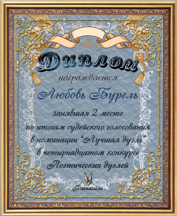 Диплом за 2-е место в номинации "ЛУЧШАЯ ДУЭЛЬ" по итогам судейского голосования в 14ом конкурсе поэтических дуэлей (№ 8.1)