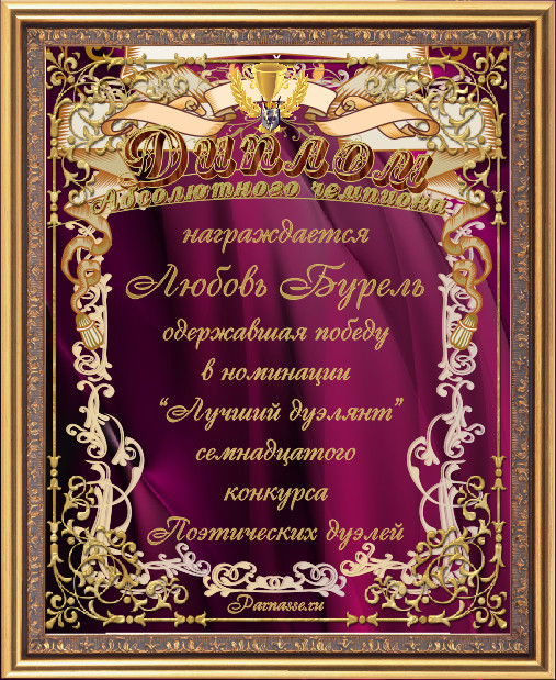 ДИПЛОМ ЧЕМПИОНА 17го КОНКУРСА ПОЭТИЧЕСКИХ ДУЭЛЕЙ В НОМИНАЦИИ "ЛУЧШИЙ ДУЭЛЯНТ"