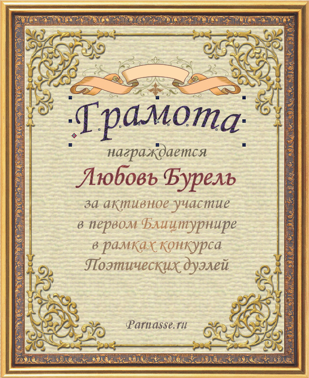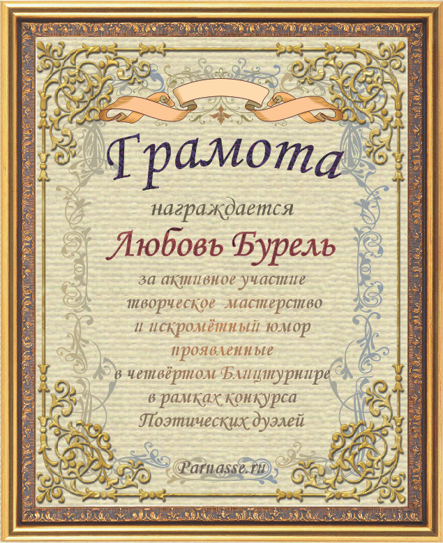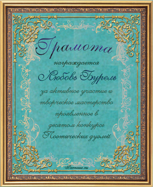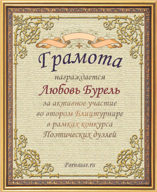 Диплом присуждён в номинации "самый активный дуэлянт" пятого конкурса поэтических дуэлей