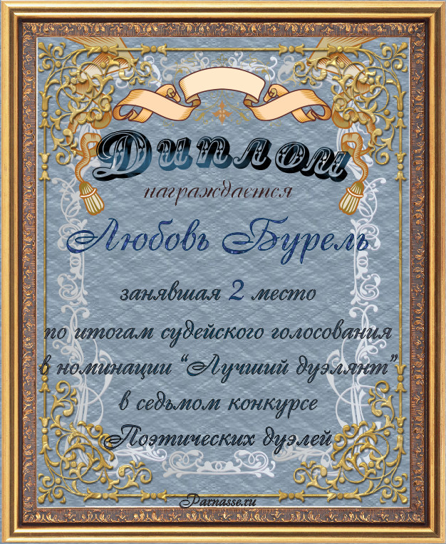 Диплом за 2-е место в номинации "Лучший дуэлянт" по итогам судейского голосования в седьмом конкурсе поэтических дуэлей