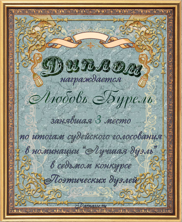 Диплом за 3-е место в номинации "Лучшая дуэль" по итогам судейского голосования в седьмом конкурсе поэтических дуэлей
