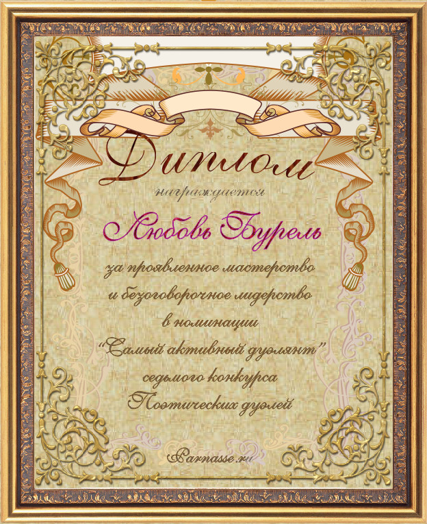 Диплом присуждён в номинации "Самый активный дуэлянт" седьмого конкурса поэтических дуэлей