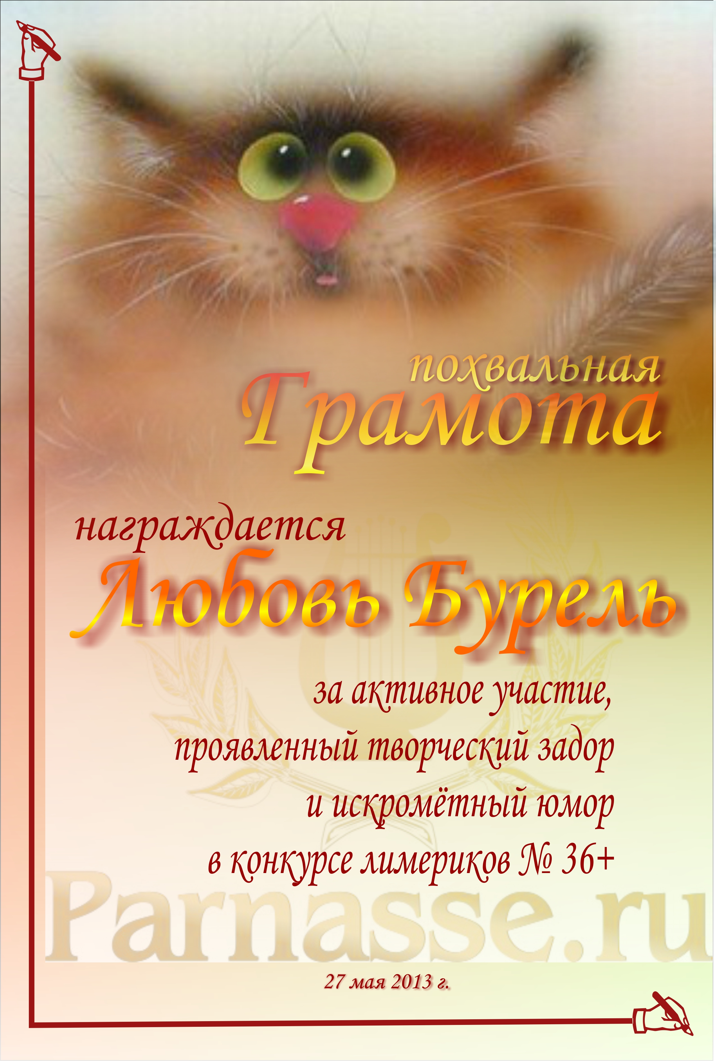 Похвальная грамота за 4 место в конкурсе лимериков № 36+ (27.05.2013 г.)