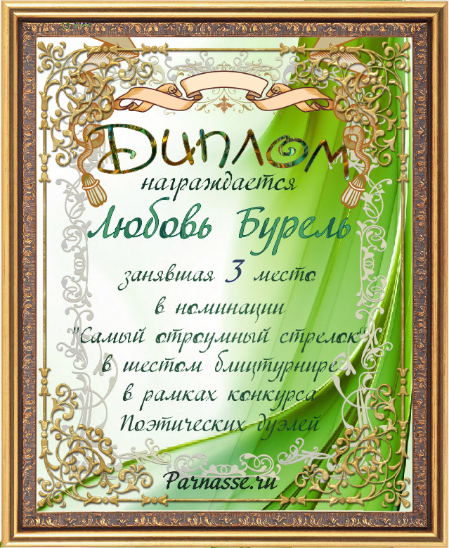 Диплом за 3-е место в номинации "Лучшая дуэль" в шестом конкурсе поэтических дуэлей (дуэль 19.1)