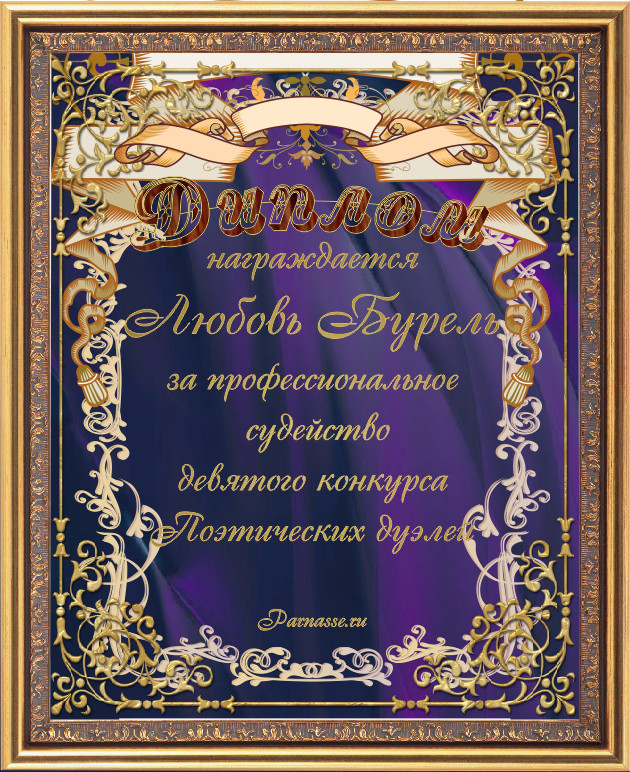 ДИПЛОМ ЗА ПРОФЕССИОНАЛЬНОЕ СУДЕЙСТВО В ДЕВЯТОМ КОНКУРСЕ ПОЭТИЧЕСКИХ ДУЭЛЕЙ