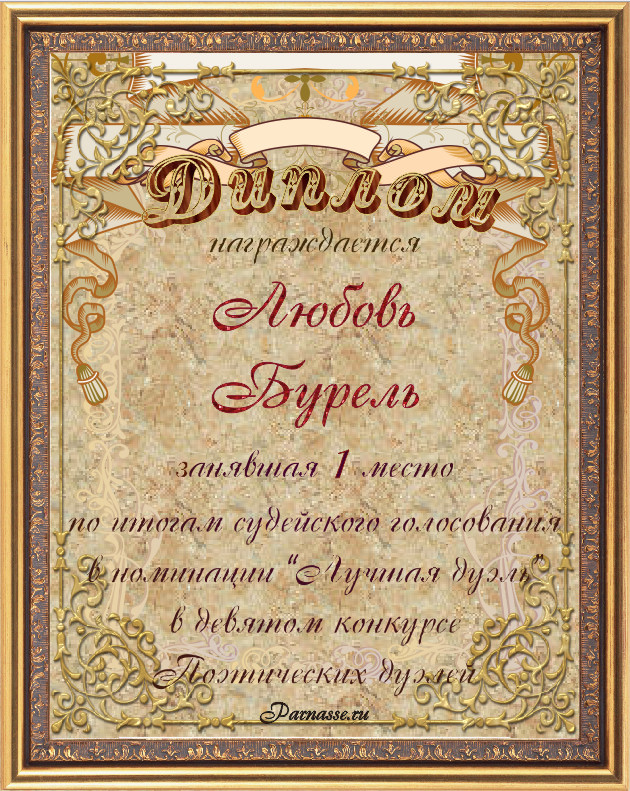 Диплом за 1-е место в номинации "Лучшая дуэль" по итогам судейского голосования в девятом конкурсе поэтических дуэлей(№ 21.1)