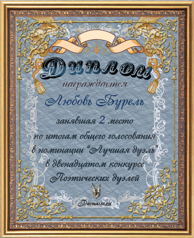 Диплом за 2-е место в номинации "ЛУЧШАЯ ДУЭЛЬ" по итогам судейского голосования в 15ом конкурсе поэтических дуэлей (№ 8.1)