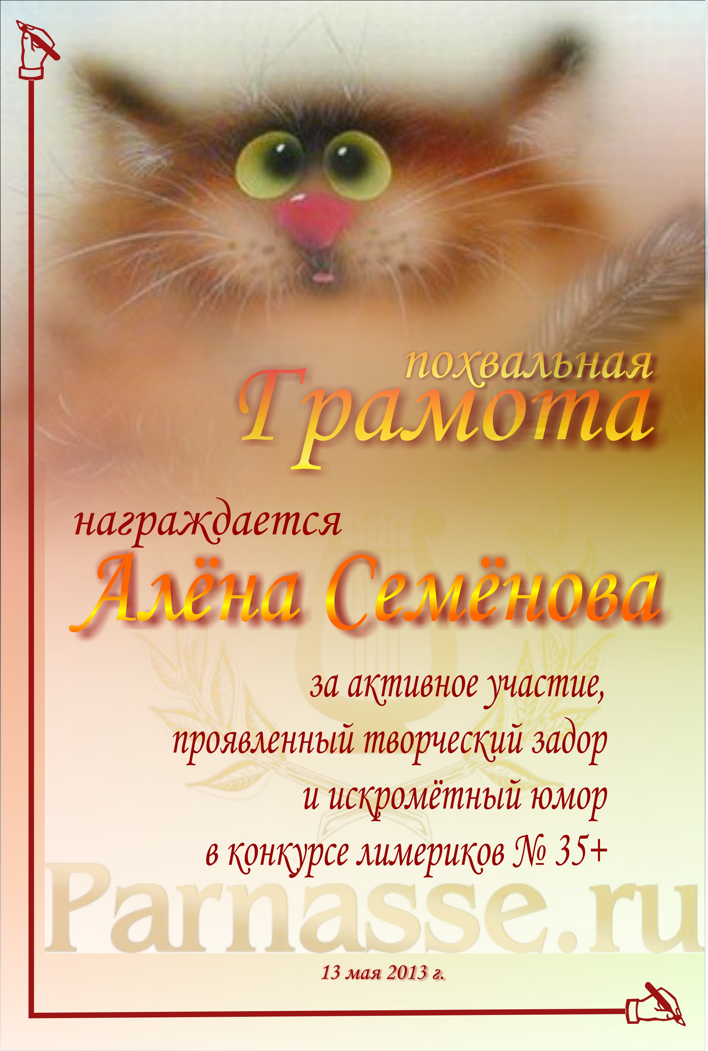 Похвальная грамота за 4 место в конкурсе лимериков № 35+ (13.05.2013 г.)