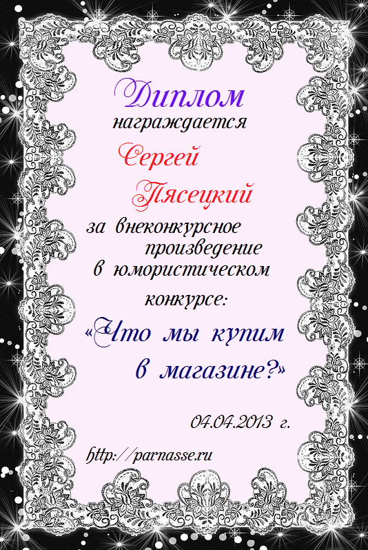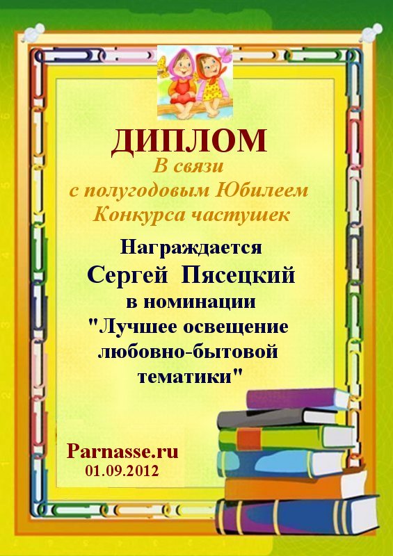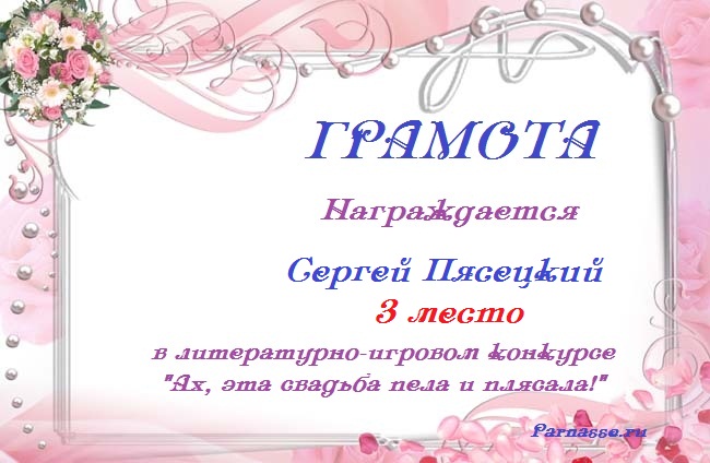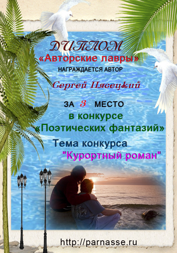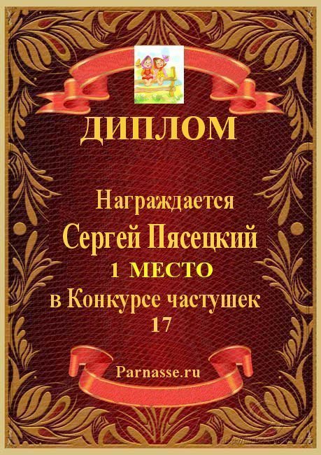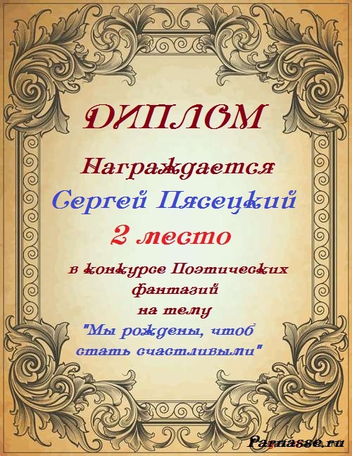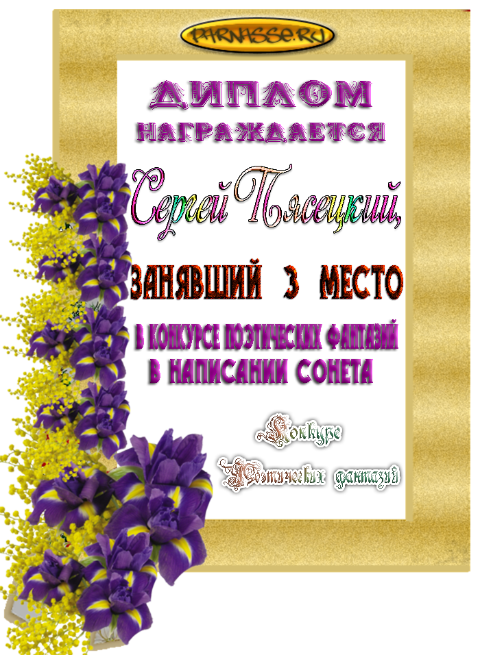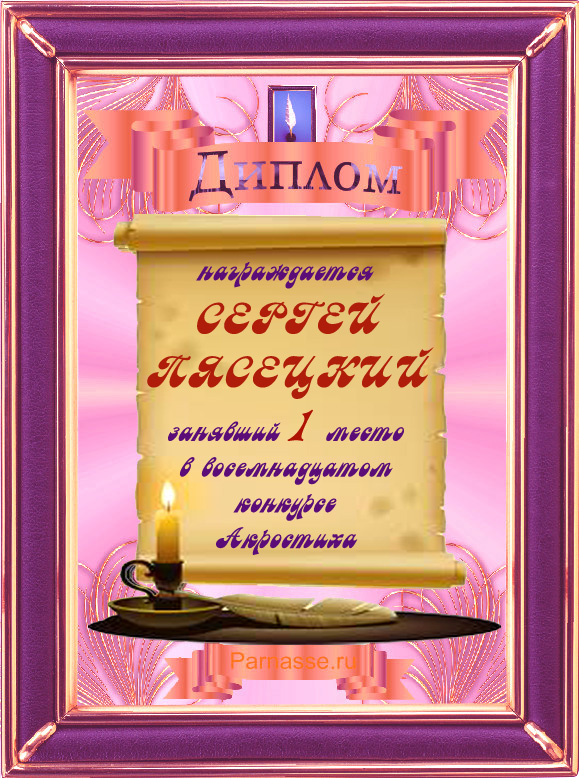 За неугасающую и неисчерпаемую творческую активность, постоянный контакт с Музой и признание сообществом "Парнасцев".От всей души желаем Вам, Сергей, здоровья, любви, успехов, благополучия, удачи и творческого вдохновения!