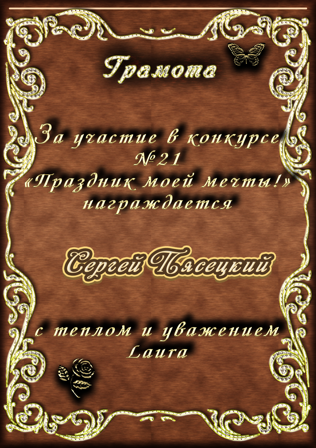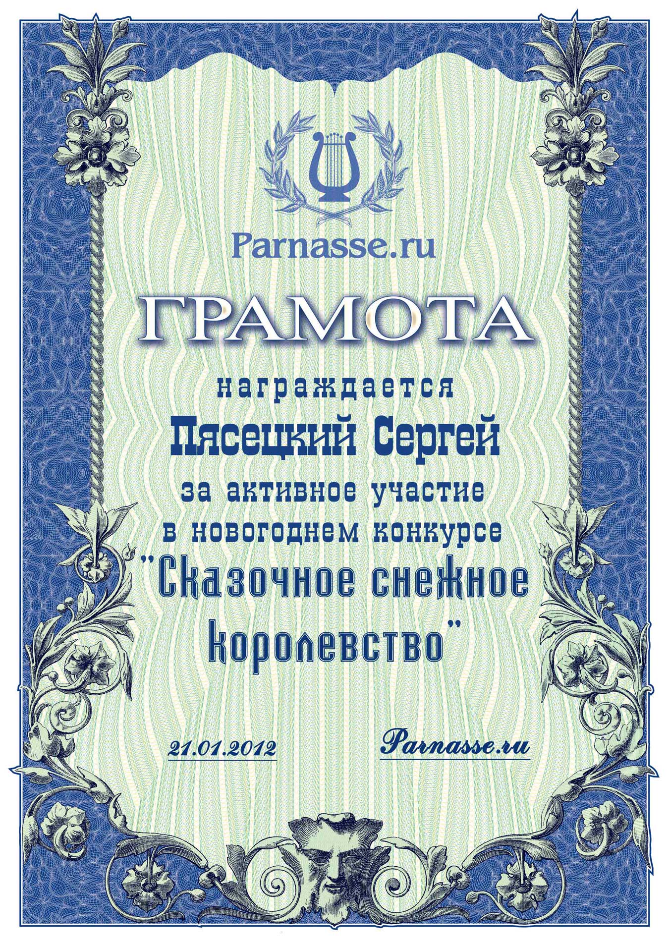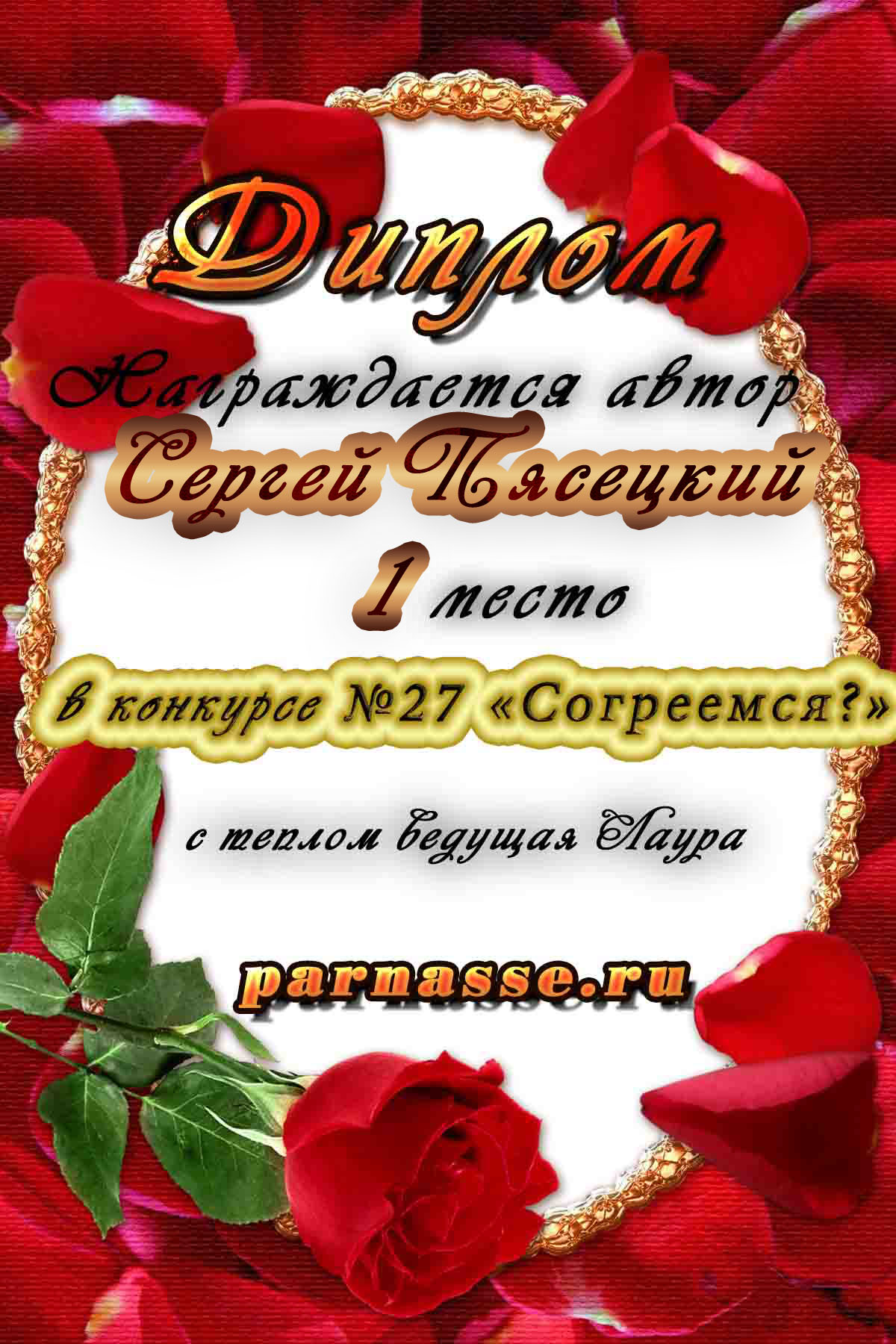 За неугасающую и неисчерпаемую творческую активность, постоянный контакт с Музой и признание сообществом "Парнасцев".От всей души желаем Вам, Сергей, здоровья, любви, успехов, благополучия, удачи и творческого вдохновения!