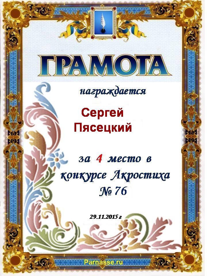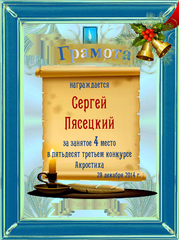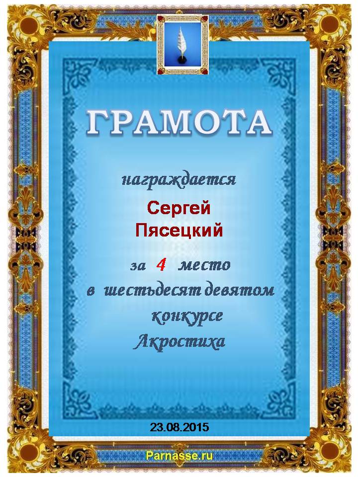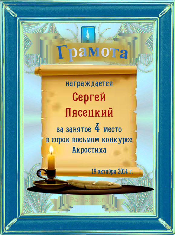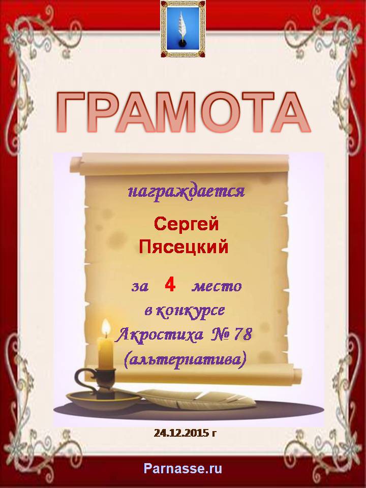 Грамота за 4 место во 2 годовом конкурсе Акростиха по итогам судейского голосования! ПОЗДРАВЛЯЮ!