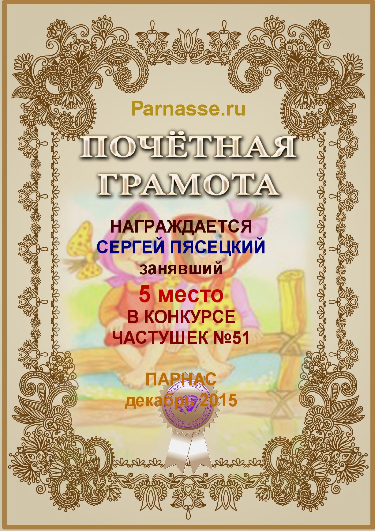 Похвальная грамота за 5 место и активное участие в конкурсе лимериков № 73+ (27.11.2015 г.)