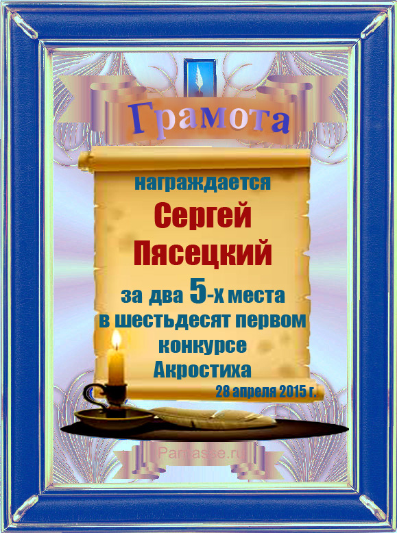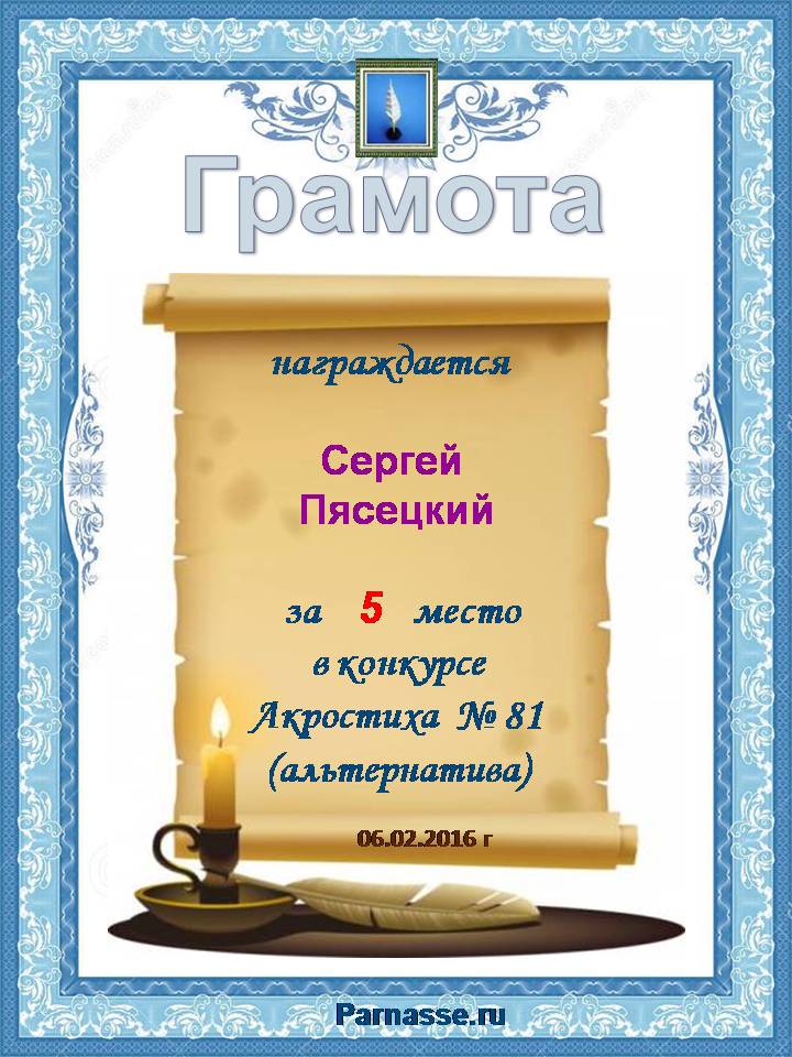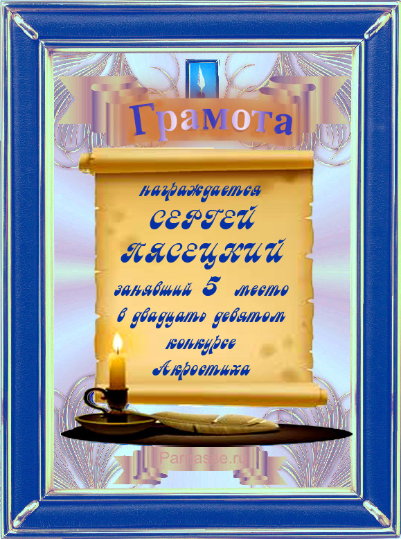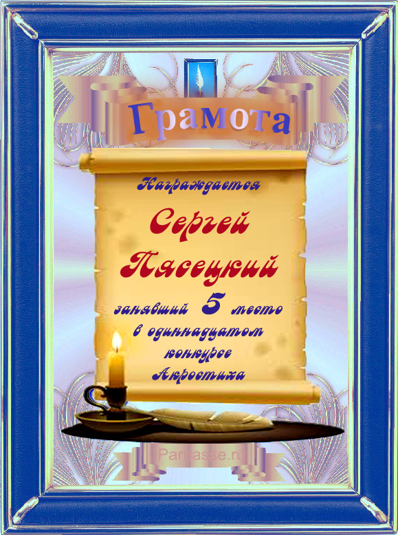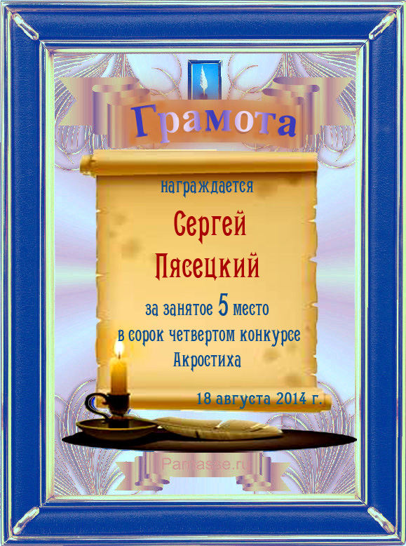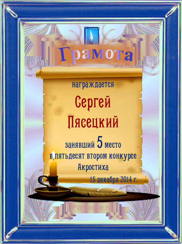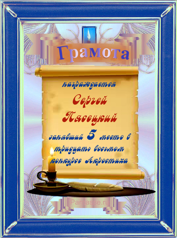 Грамота за 5 место во 2 годовом конкурсе Акростиха по итогам судейского голосования! ПОЗДРАВЛЯЮ!