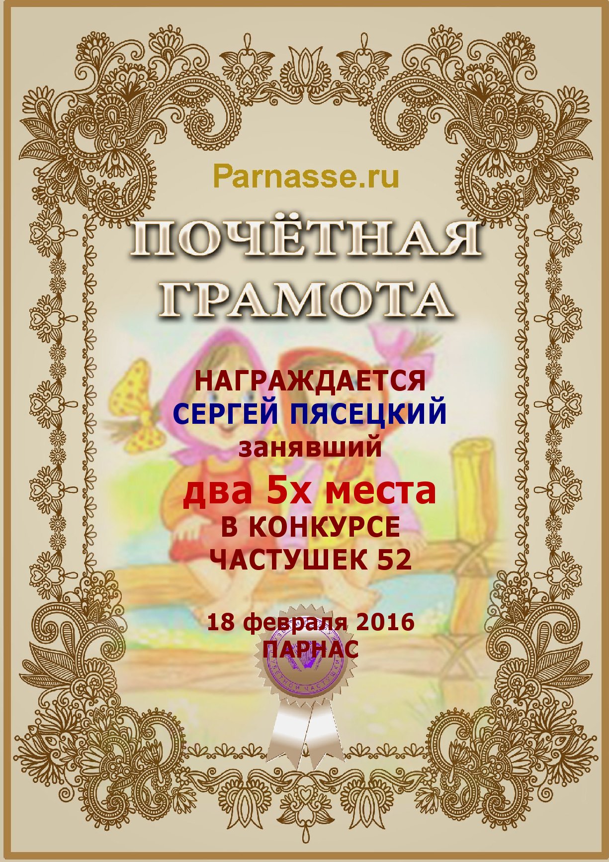 Похвальная грамота за 5 место в конкурсе лимериков № 66+ (2.03.2015 г.)