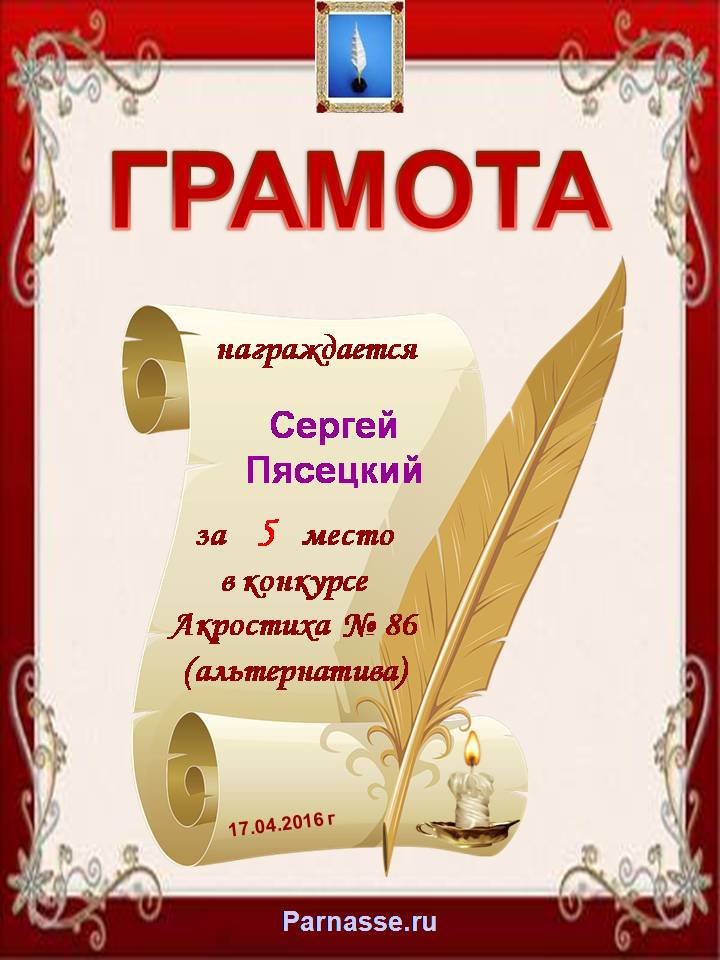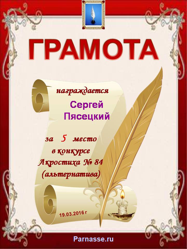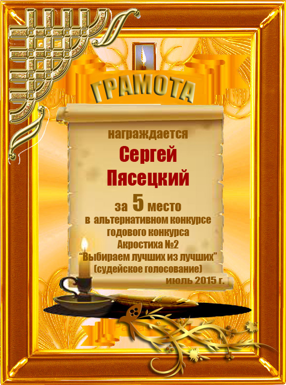 Грамота за 5 место во 2 годовом конкурсе Акростиха по итогам судейского голосования (Альтернатива)! ПОЗДРАВЛЯЮ!