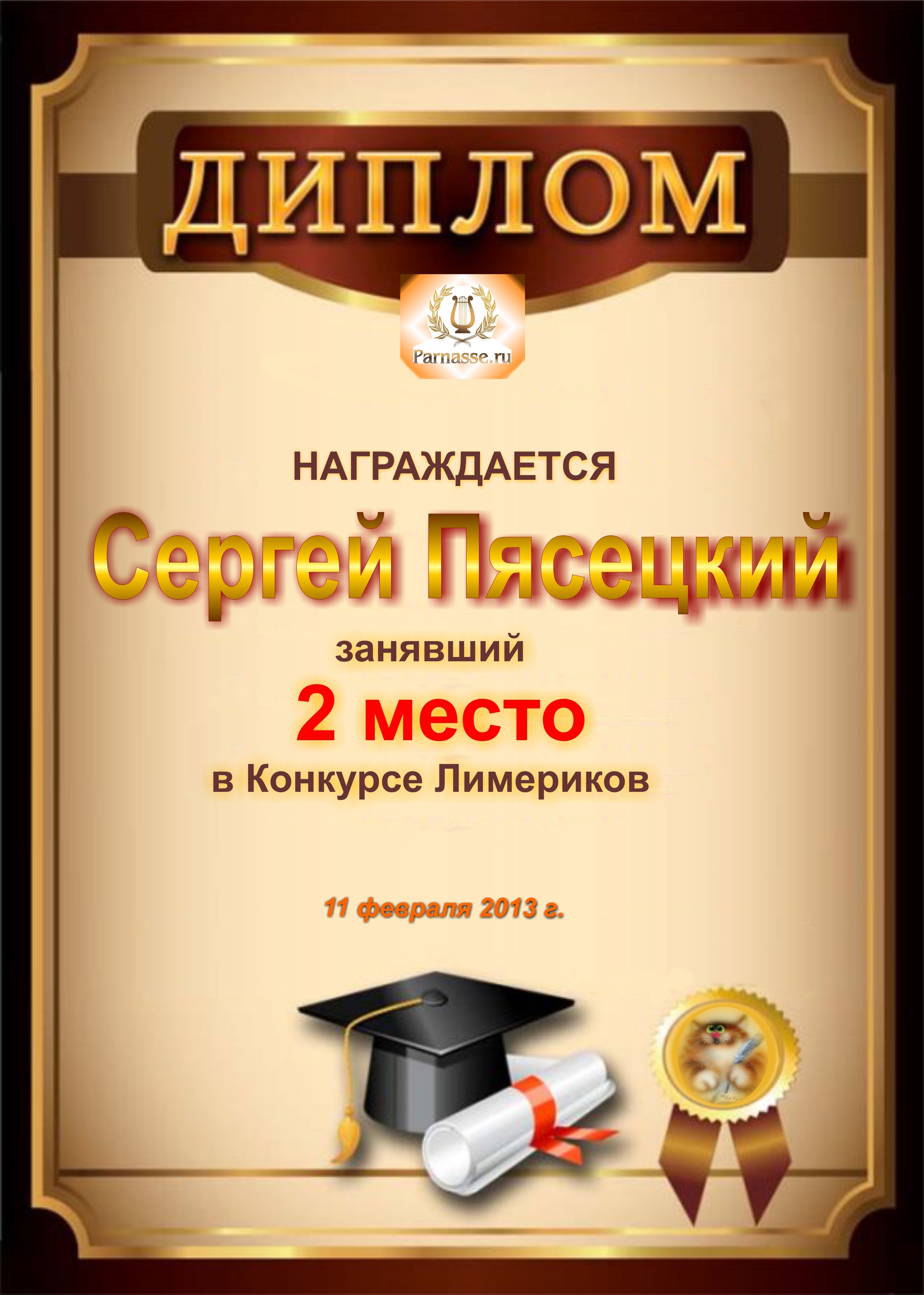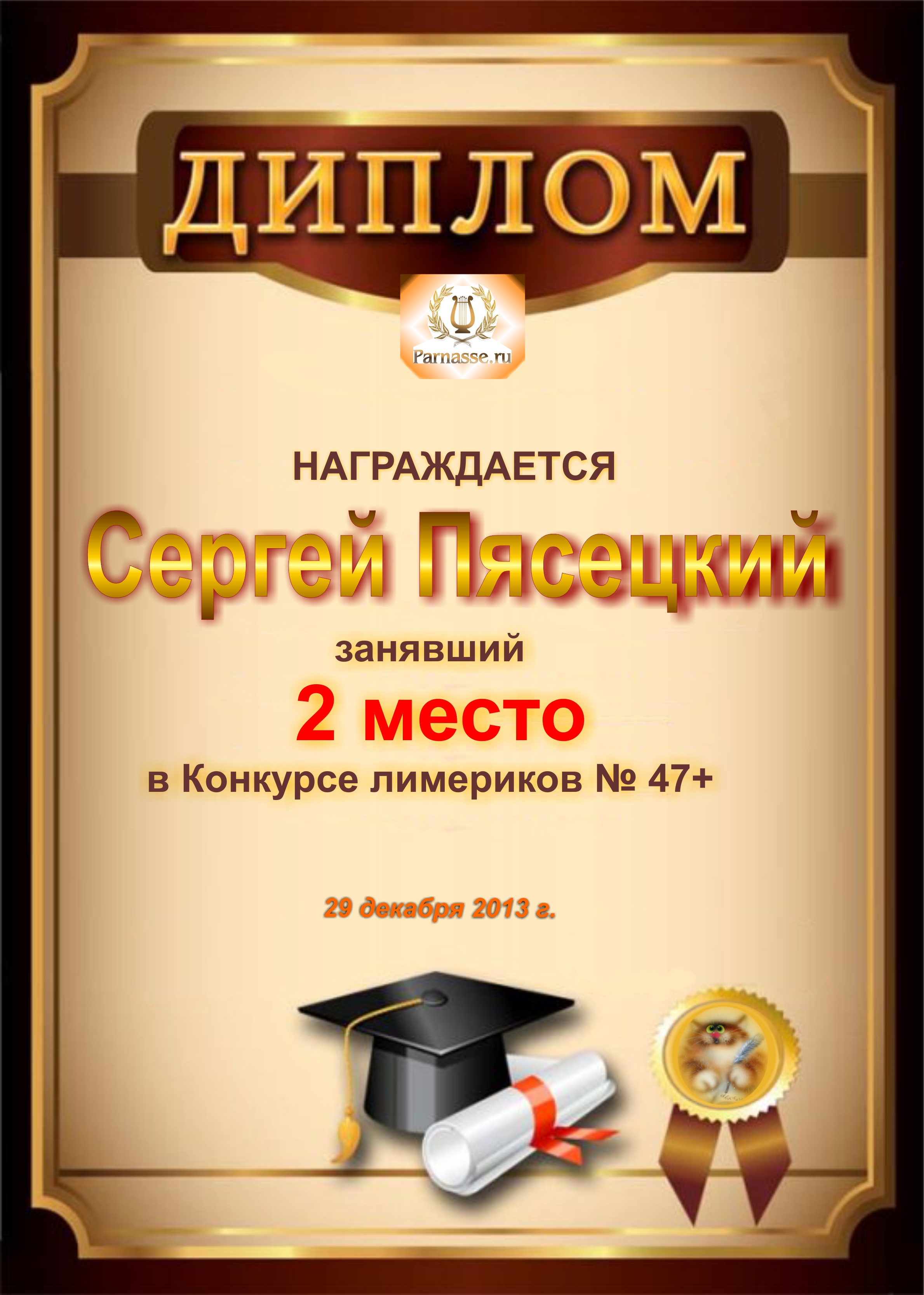 Диплом за победу и 3 место в дополнительной номинации конкурса лимериков № 53+ (4.05.2014 г.)