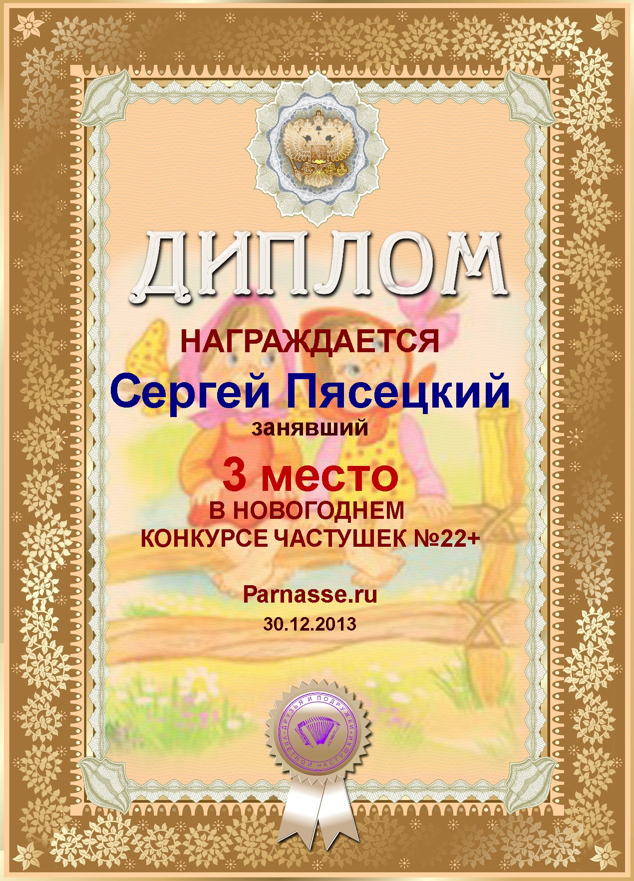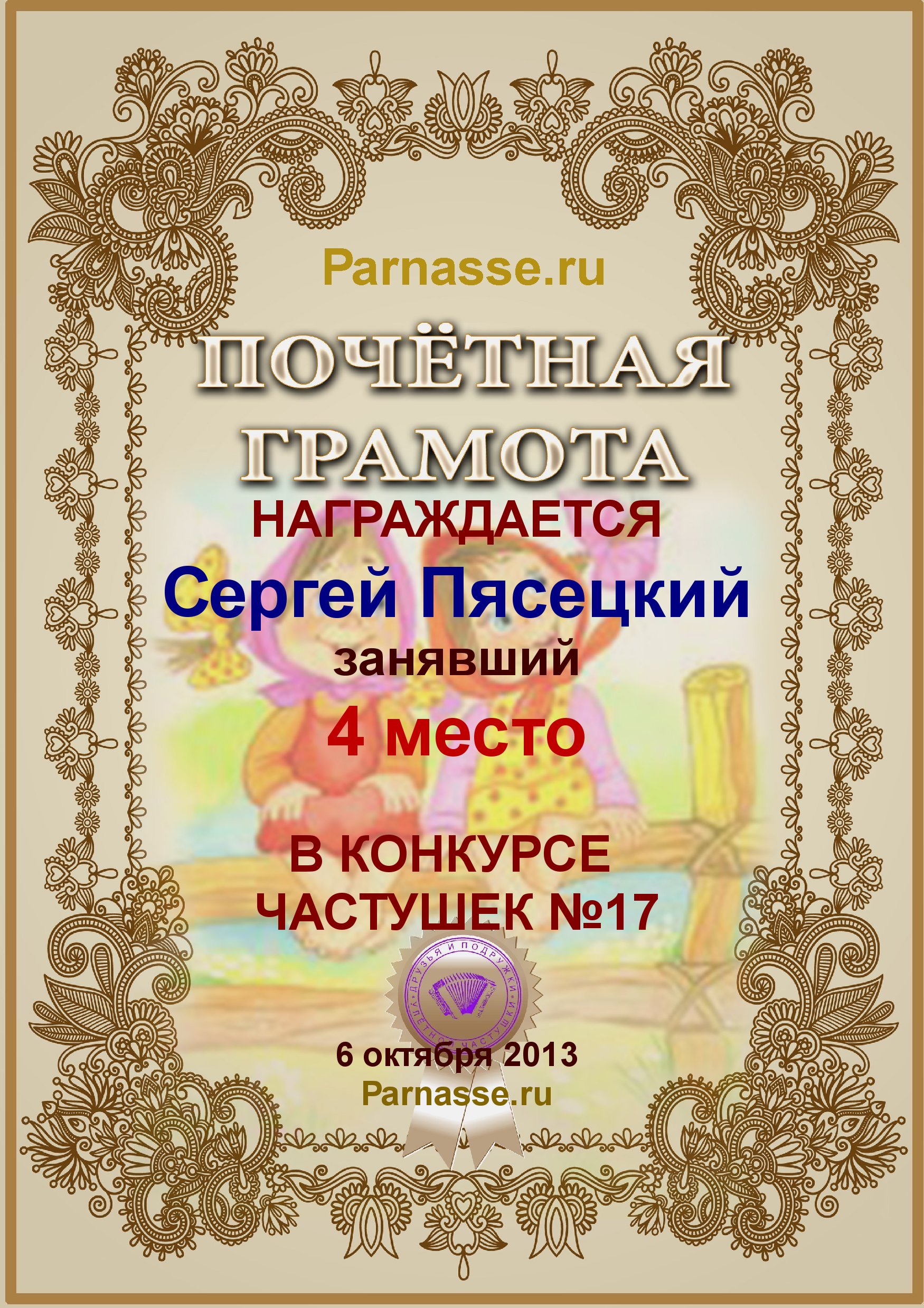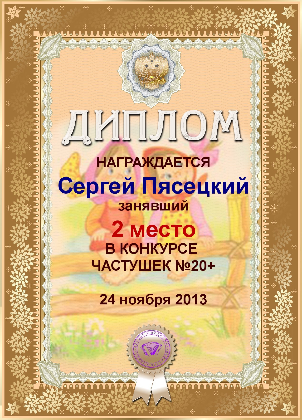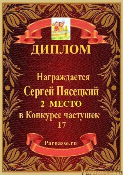 СЕРГЕЙ, ПОЗДРАВЛЯЮ ВАС С ДВОЙНЫМ ПОЧЕТНЫМ - 4 МЕСТОМ В КОНКУРСЕ ЧАСТУШЕК №9++