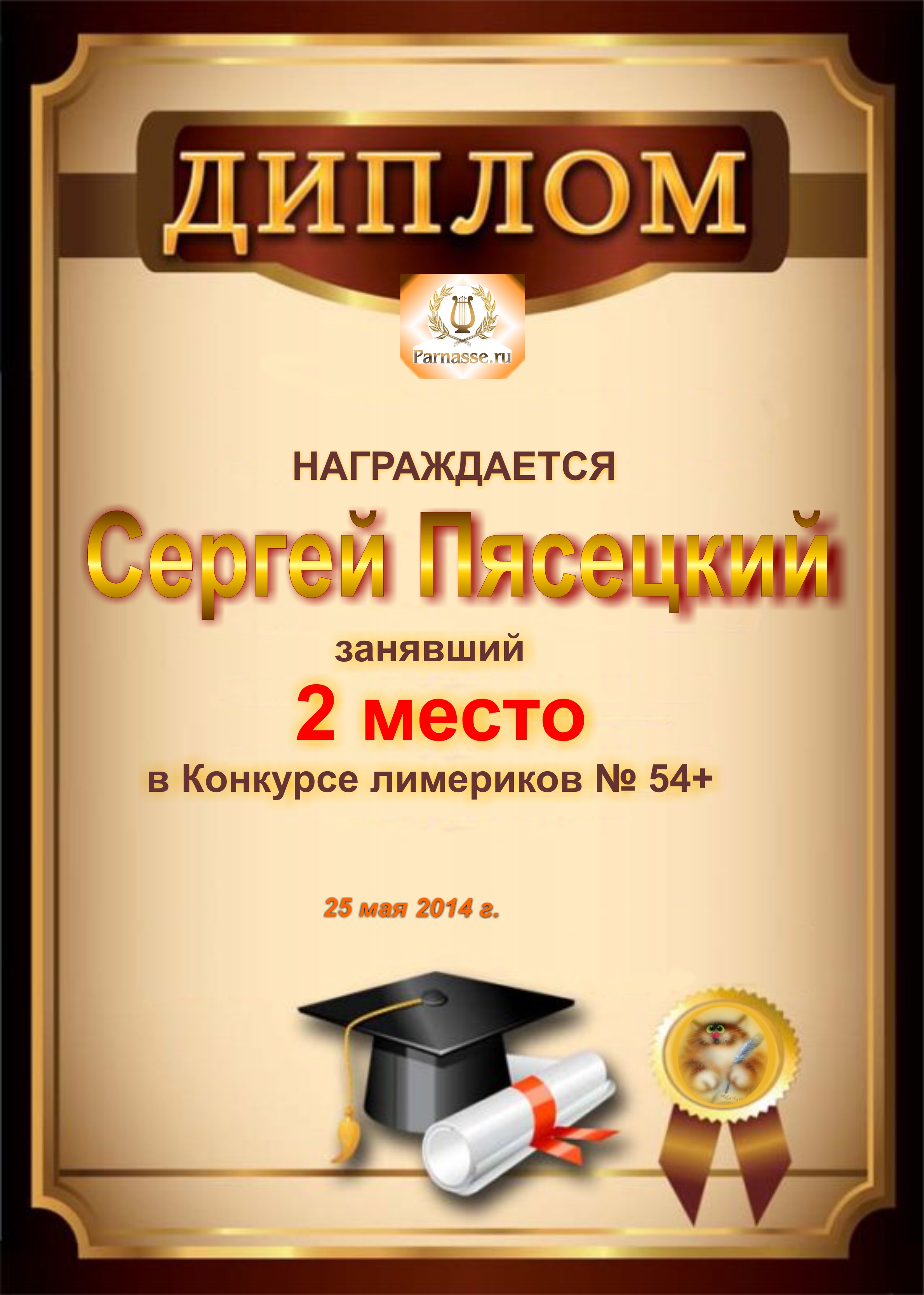 Диплом за победу и 3 место в дополнительной номинации конкурса лимериков № 54+ (25.05.2014г.)