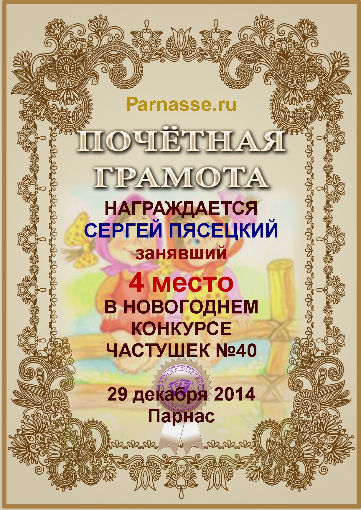 Похвальная грамота за 4 место и активное участие в конкурсе лимериков № 50+ (2.03.2014 г.)