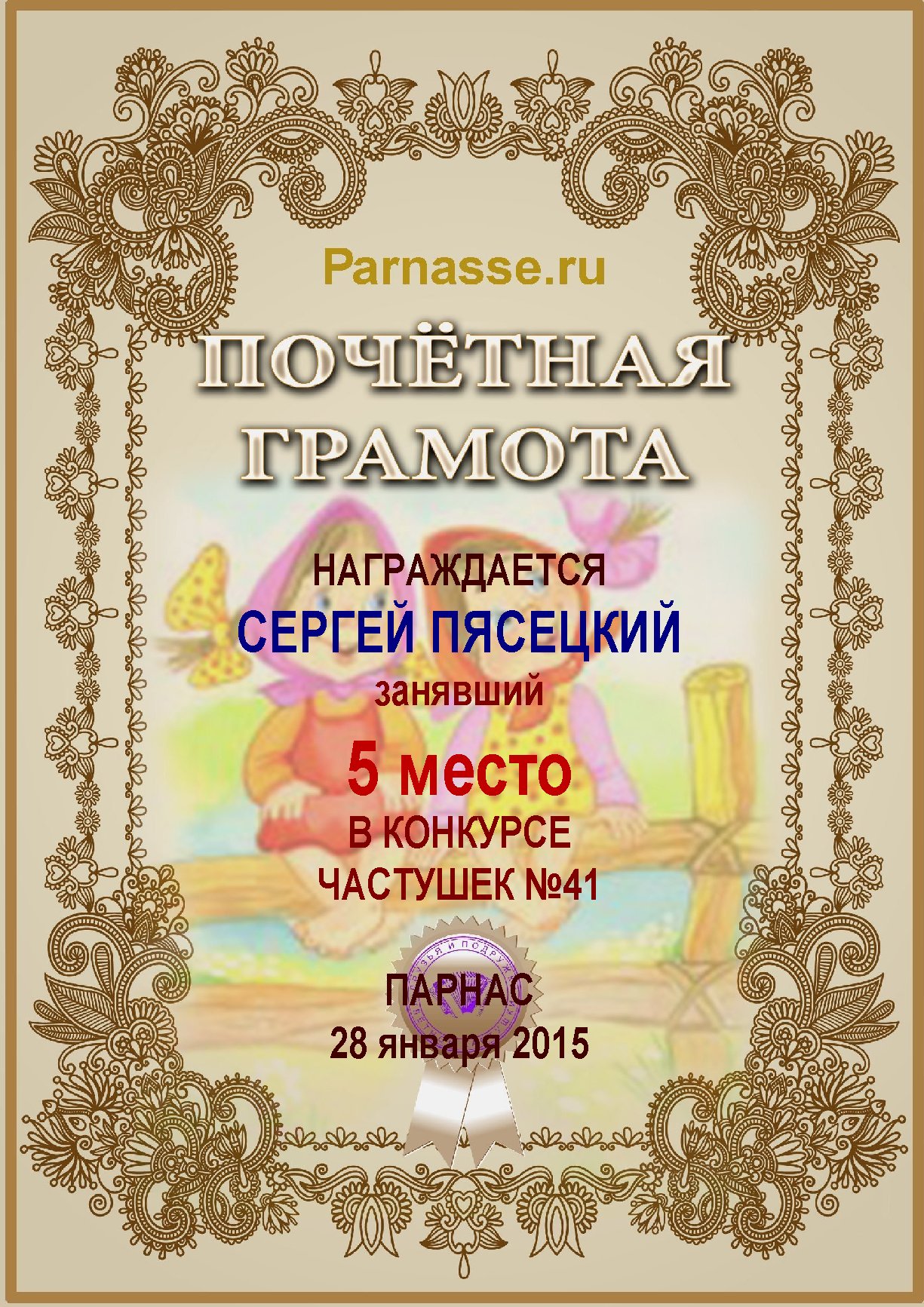 Похвальная грамота за 5 место и активное участие в конкурсе лимериков № 67+ (30.03.2015 г.)