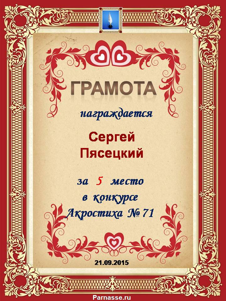 Похвальная грамота за 5 место и активное участие в конкурсе лимериков № 71+ (03.09.2015 г.)