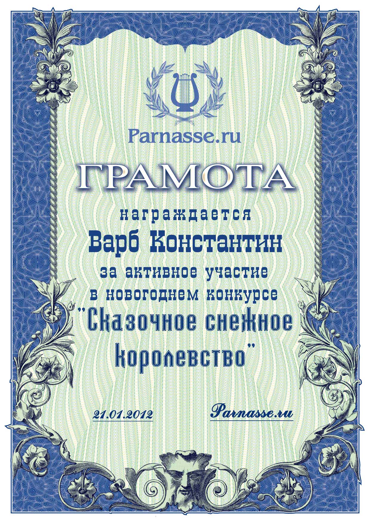 Грамота участника литературного конкурса "Сказочное снежное королевство"
