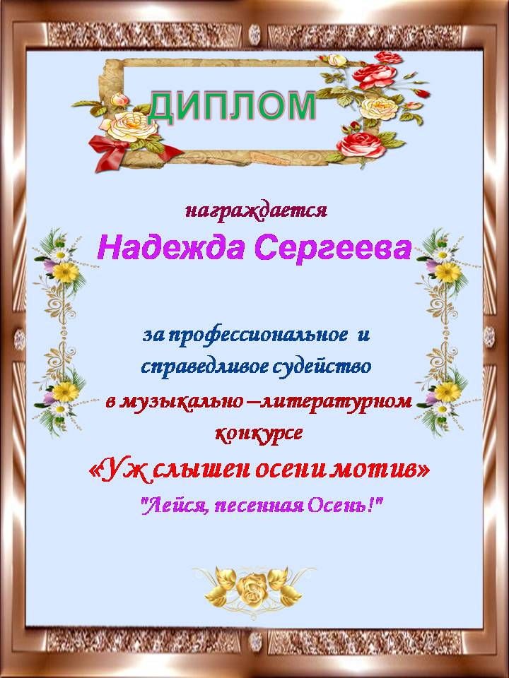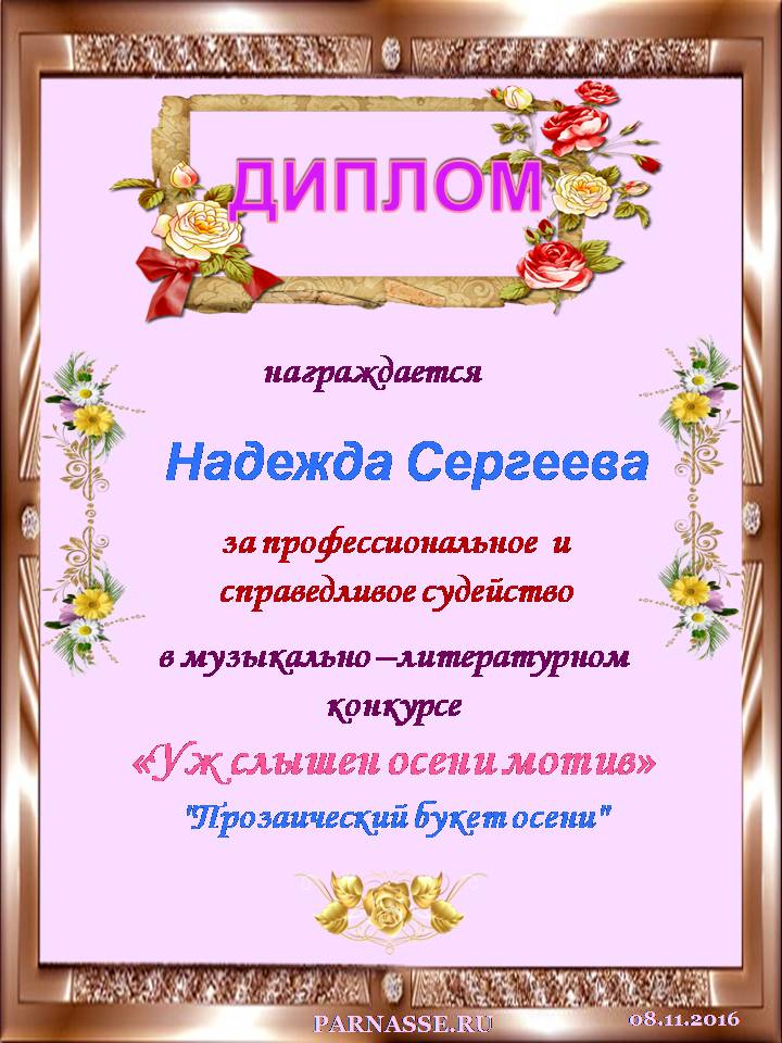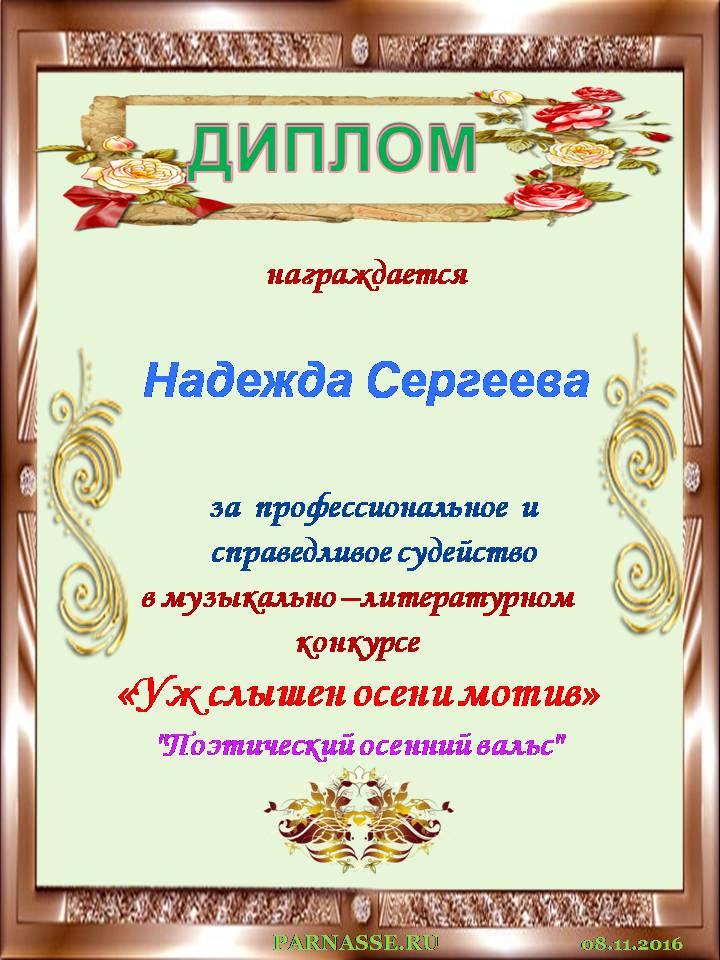 Благодарим Вас за квалифицированное, оперативное, беспристрастное судейство поэтической номинации "Поэтический осенний вальс" в музыкально-литературном конкурсе "Уж слышен Осени мотив". Большое спасибо, Надежда, за судейство, за потрясающе красивые, талантливые стихи. Удачи Вам, успехов, всех благополучий в жизни и делах.