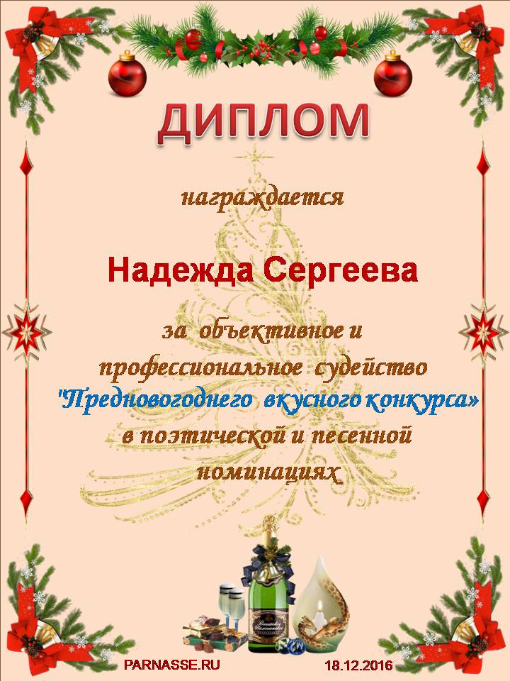 Уважаемая Надежда! Спасибо Вам большое за судейство конкурса "Предновогодний вкусный". Поздравляем с наступающим НОВЫМ 2017 ГОДОМ! Неиссякаемого ВДОХНОВЕНИЯ! С уважением и душевной теплотой, огромной благодарностью.