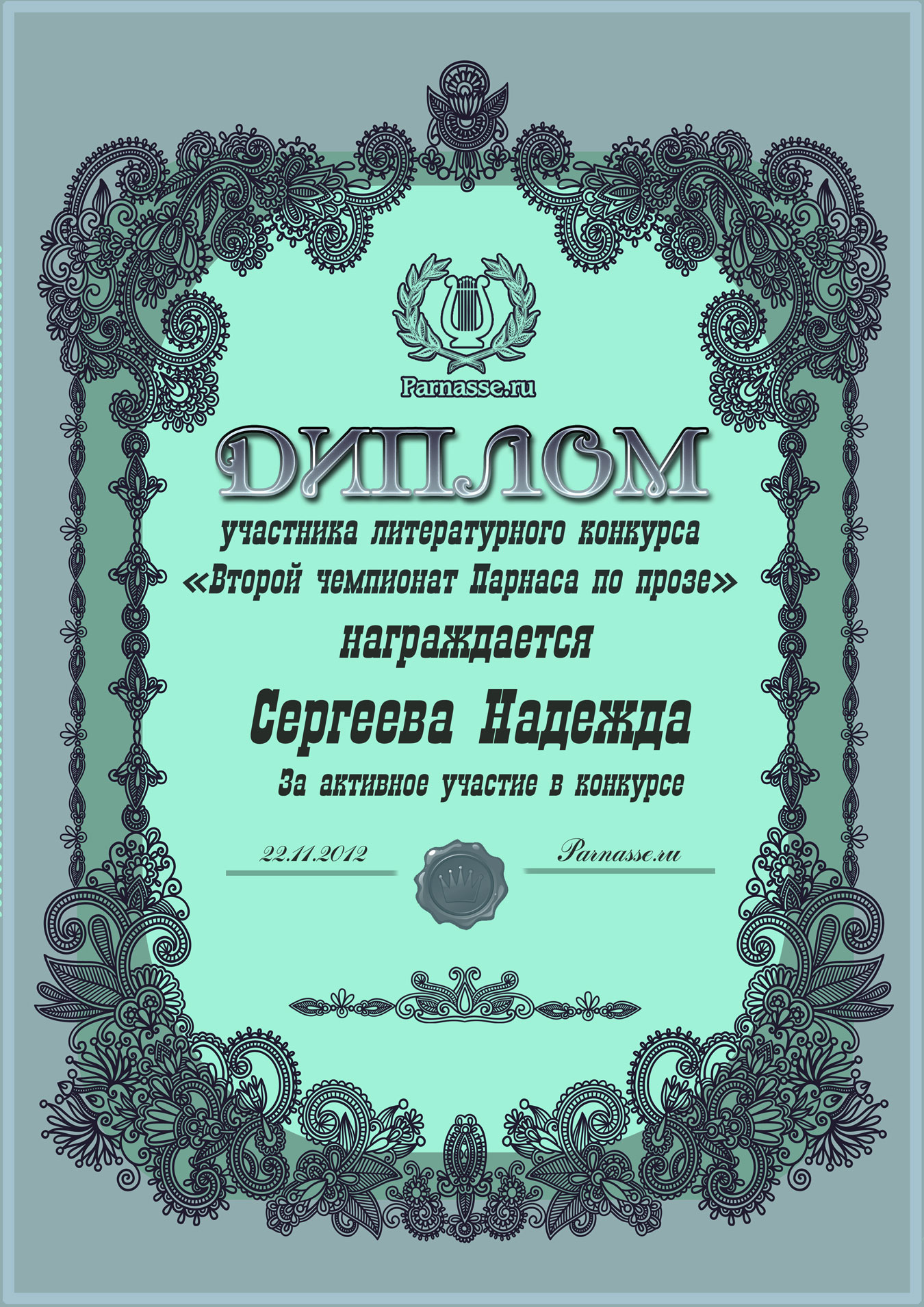 Диплом участника Второго чемпионата Парнаса по прозе.