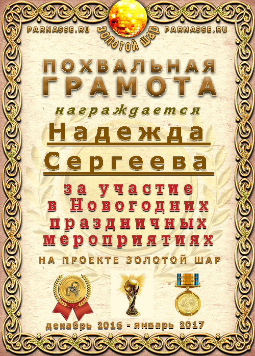Похвальная Грамота за участие в Новогодних праздничных мероприятиях на проекте "ЗОЛОТОЙ ШАР"!Поздравляем!