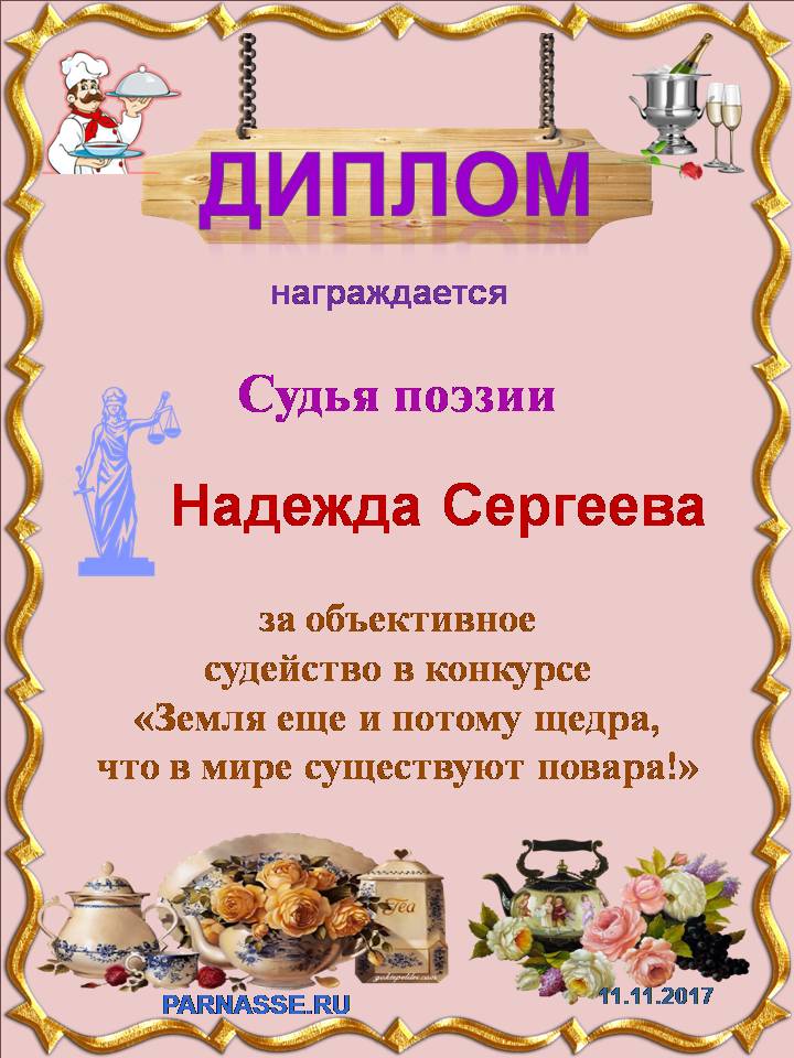 Уважаемая Надежда! Благодарим Вас за квалифицированное судейство конкурса "Земля еще и потому щедра, что в мире существуют повара!", номиция "Поздравления в стихах: Поварам — хвала и честь". Желаем успехов, процветания, крепкого здоровья и всего самого наилучшего!