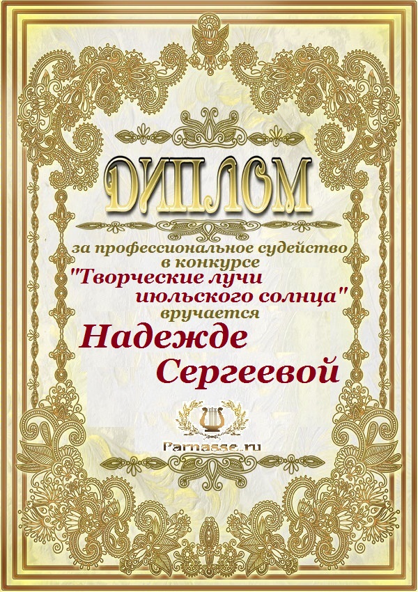 Благодарим Вас за квалифицированное, оперативное, беспристрастное судейство поэтической номинации "Жара поэту не помеха" в ЛитКонкурсе "Творческие лучи июльского солнца". Большое спасибо! Всех земных благ Вам, достатка и благополучия. Удачи и везения. Спасибо за Вашу искренность, душевность, доброту и Ваш литературный гениальный талант!