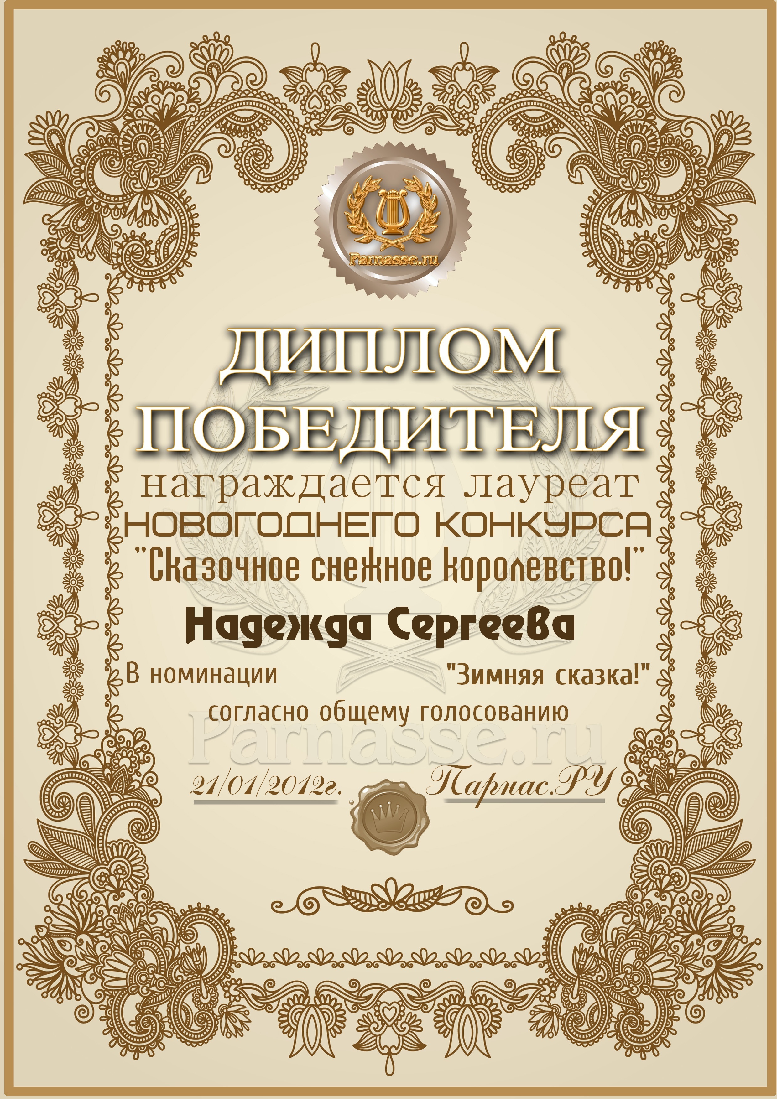 Лауреату новогоднего конкурса "Сказочное снежное королевство!" за первое место в номинации "Зимняя сказка!" согласно общему голосованию.Произведение «Дари радость».