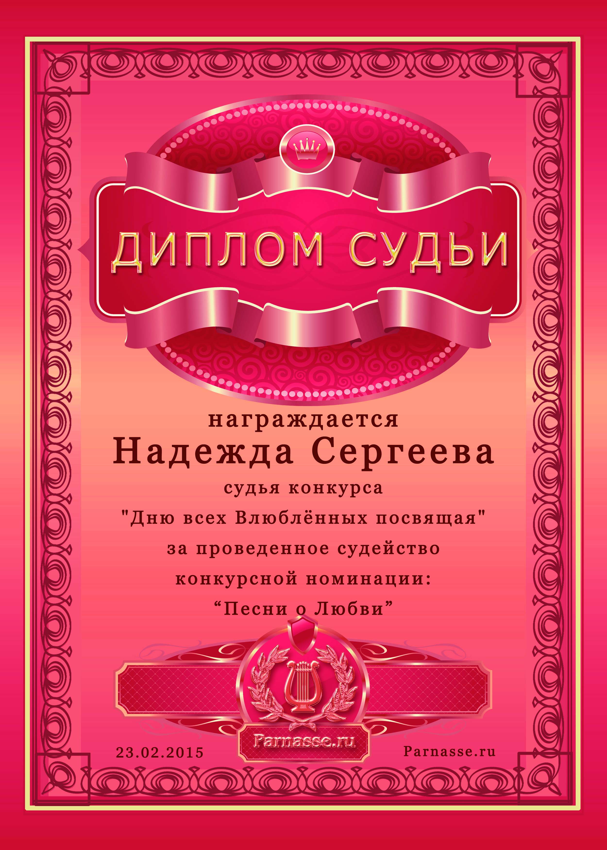 Диплом за профессиональное судейство конкурса "Дню всех Влюблённых посвящая".