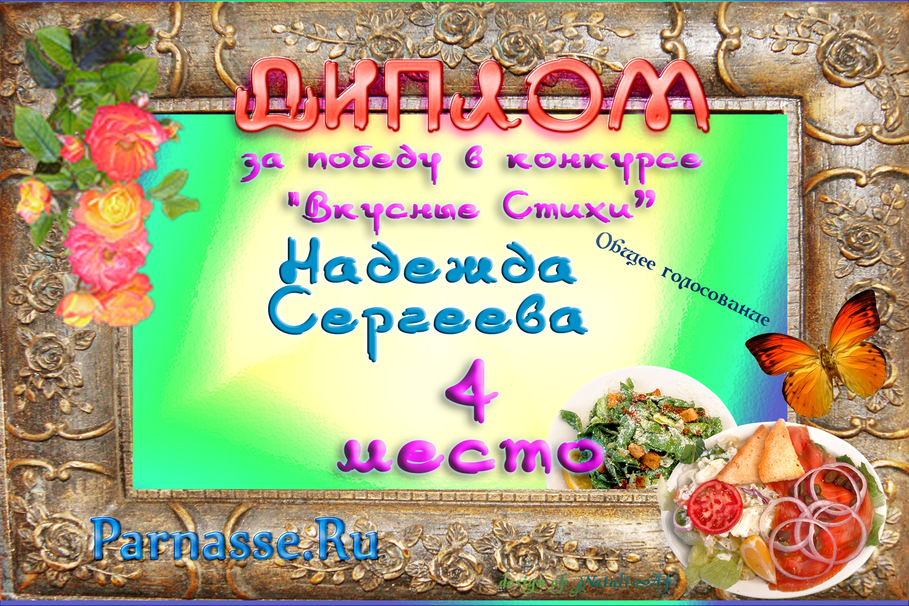 Уважаемая Надежда!От всего сердца поздравляем Вас с блестящей ПОБЕДОЙ в номинации «Вкусная ПОЭЗИЯ», во "Вкусном конкурсе"