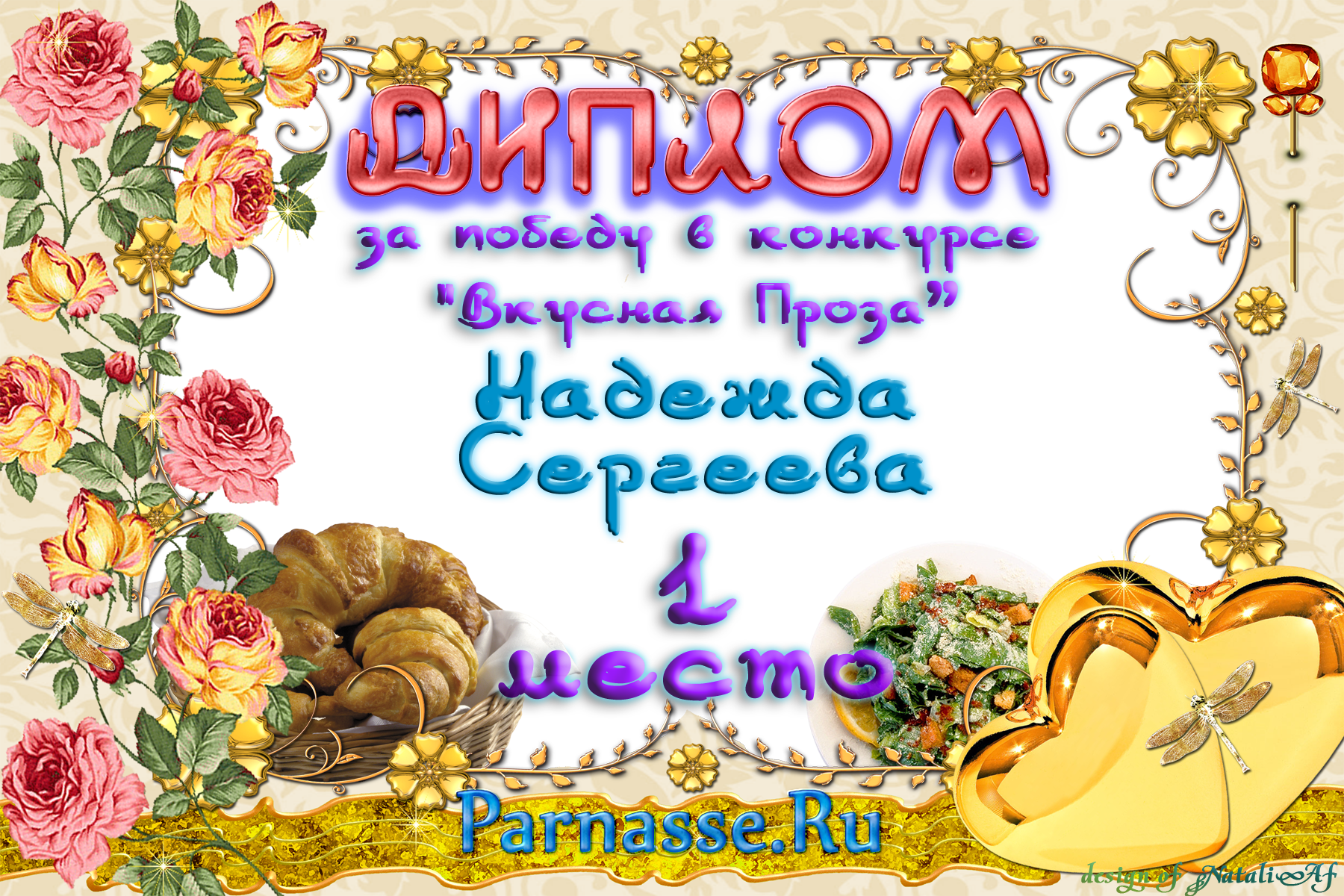 Уважаемая Надюша!От всего сердца поздравляем Вас с блестящей ПОБЕДОЙ в номинации «Вкусная ПРОЗА», во "Вкусном конкурсе"