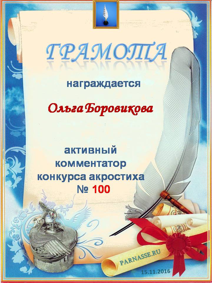 Грамота за активное комментирование в юбилейном конкурсе Акростиха № 100! Поздравляю!
