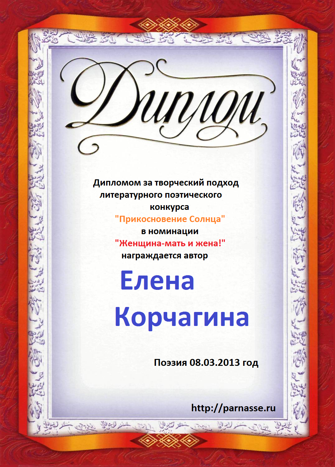 Победителю музыкально-литературного конкурса "Ах, Мама, Мамочка, родная!" Номинация "Стихи о Мамочке". Поздравляем! Счастья Вам, прекрасного настроения, вдохновения, успехов и всего замечательного. Спасибо за участие в конкурсе. С Уважением, Администрация.