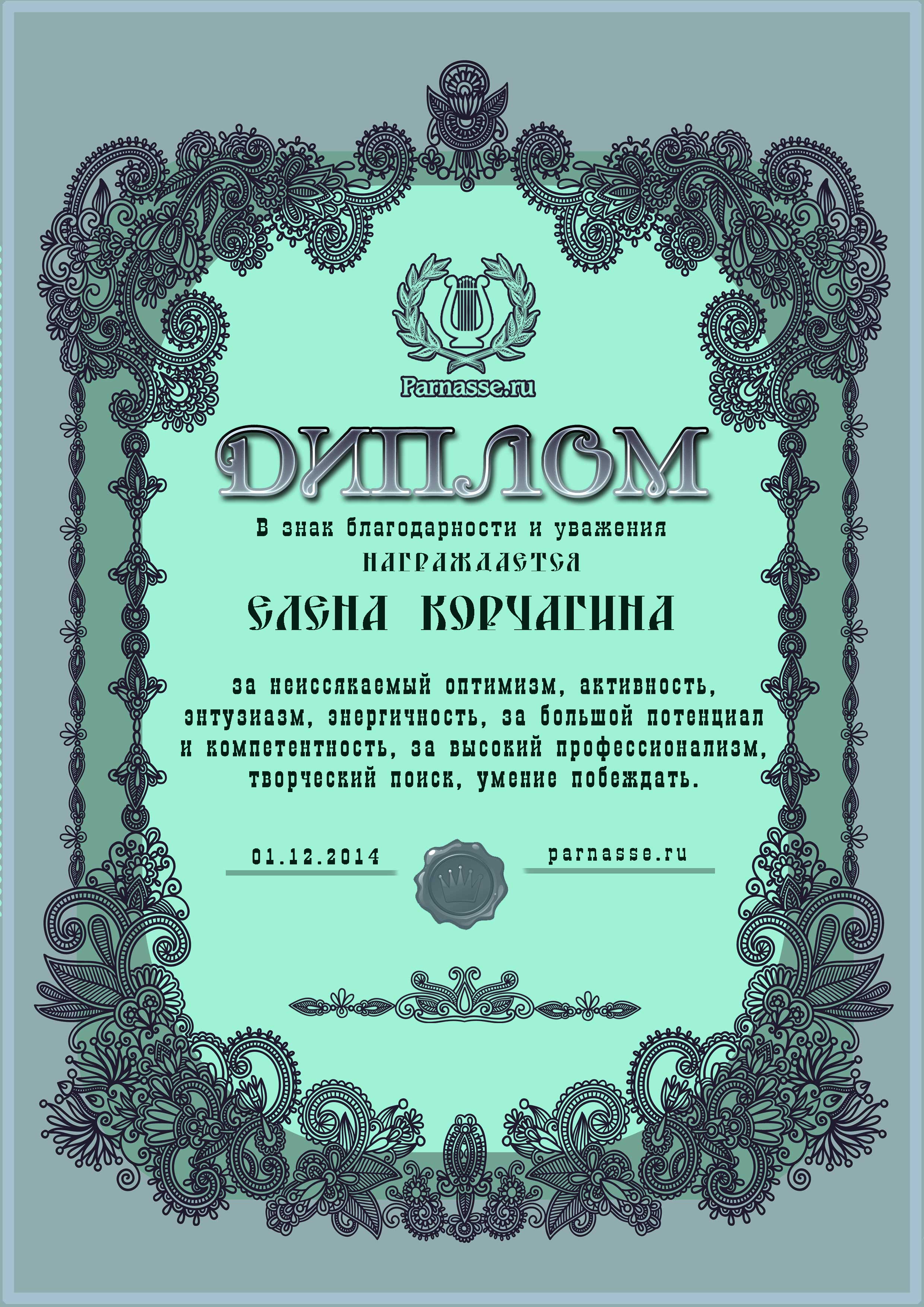 За неугасающую и неисчерпаемую творческую активность, постоянный контакт с Музой и признание сообществом "Парнасцев".От всей души желаем Вам, Елена, здоровья, любви, успехов, благополучия, удачи и творческого вдохновения!