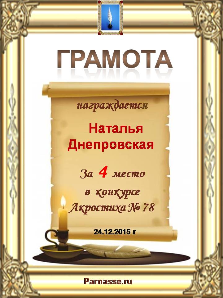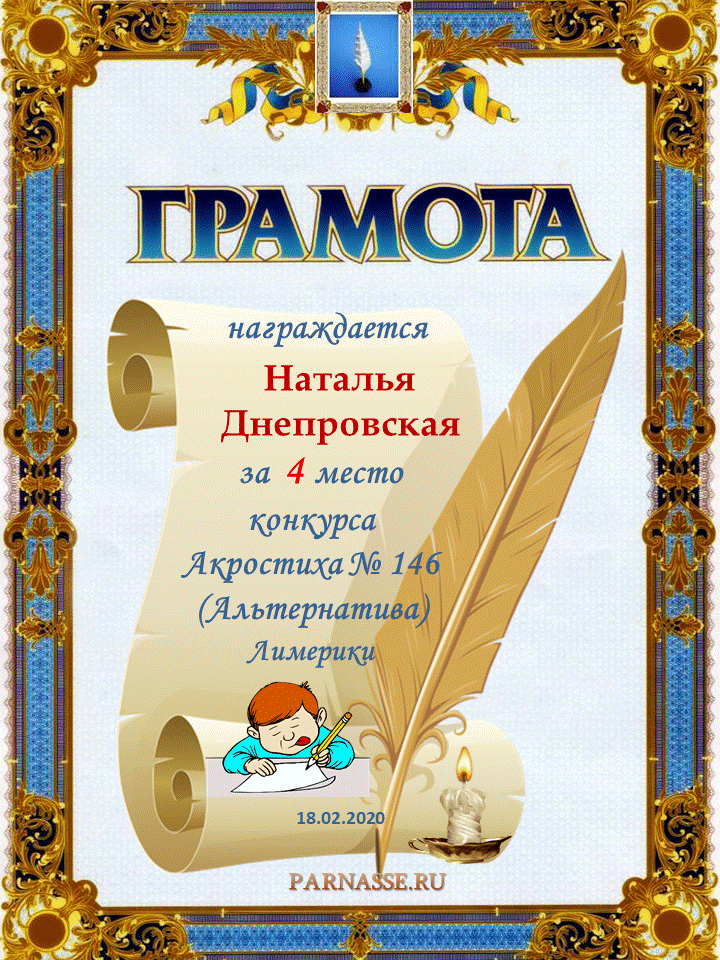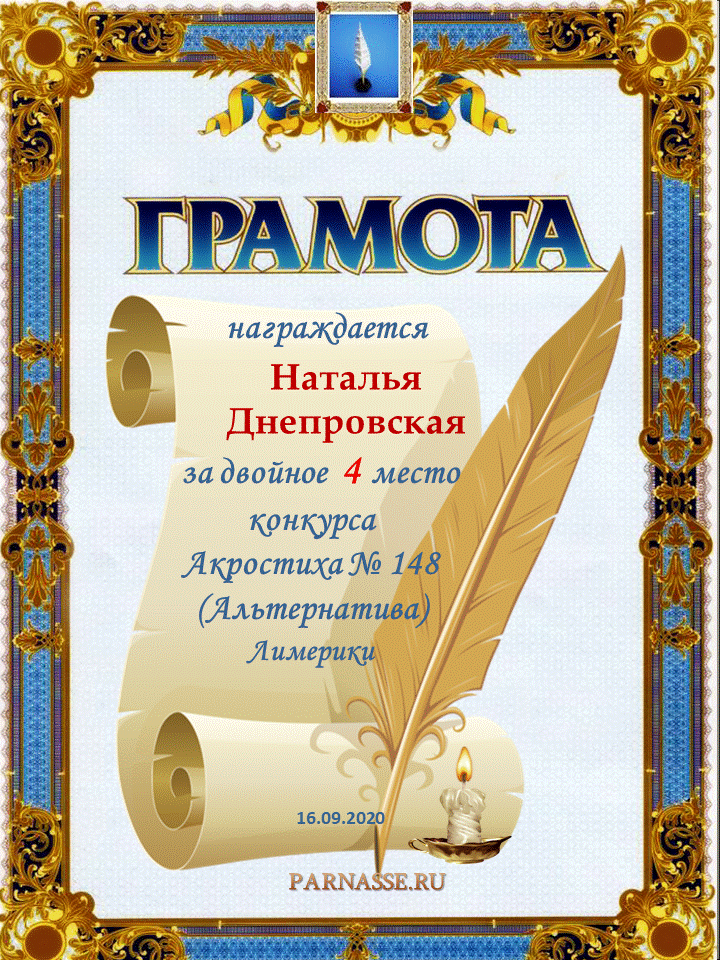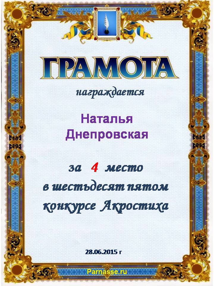 Грамота за 4 место в 140 конкурсе АКРОСТИХА (Альтернатива)! ПОЗДРАВЛЯЮ!