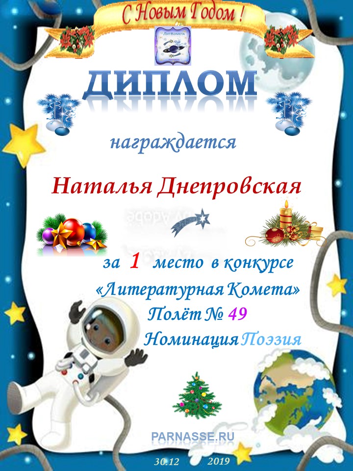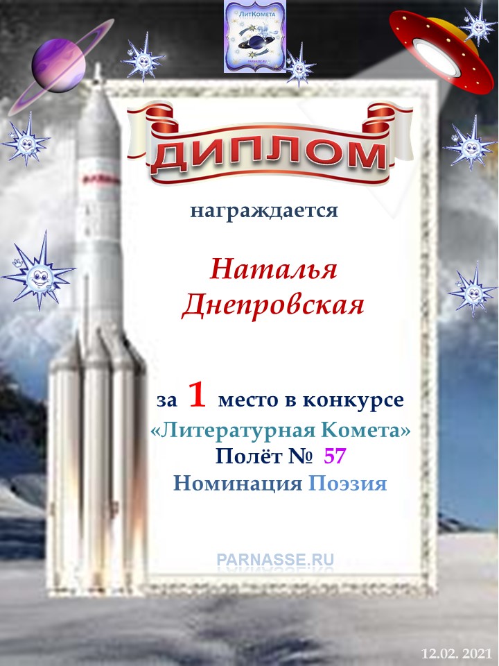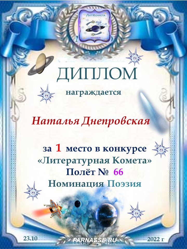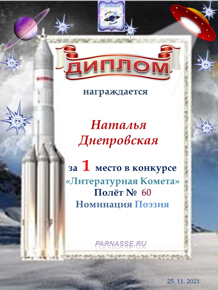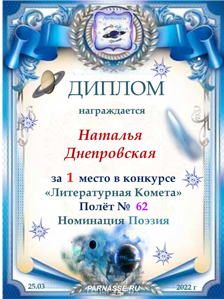 Поздравляю с занятым 1 местом в конкурсе «Литературная Комета – Полёт № 35» - номинация поэзия!