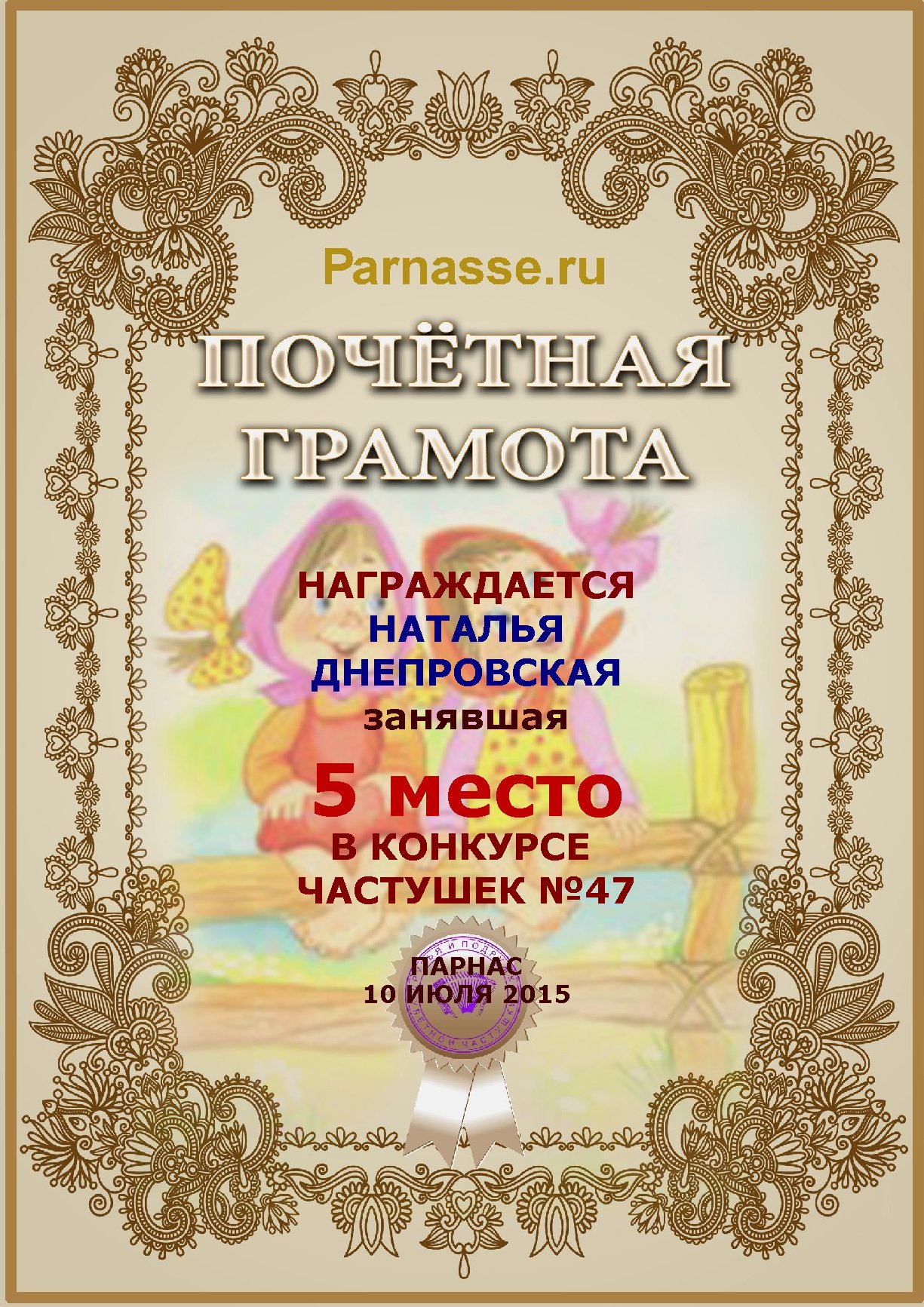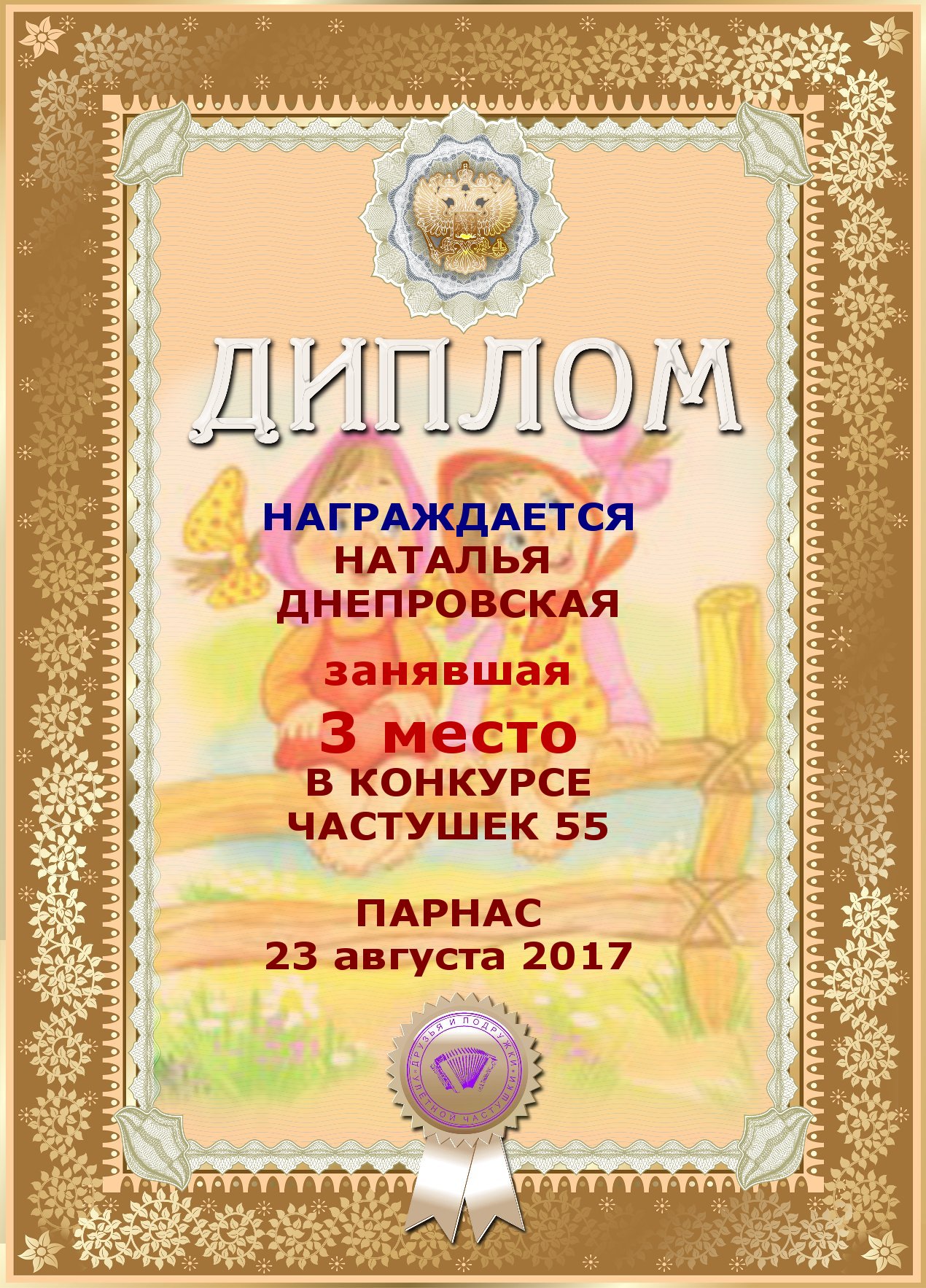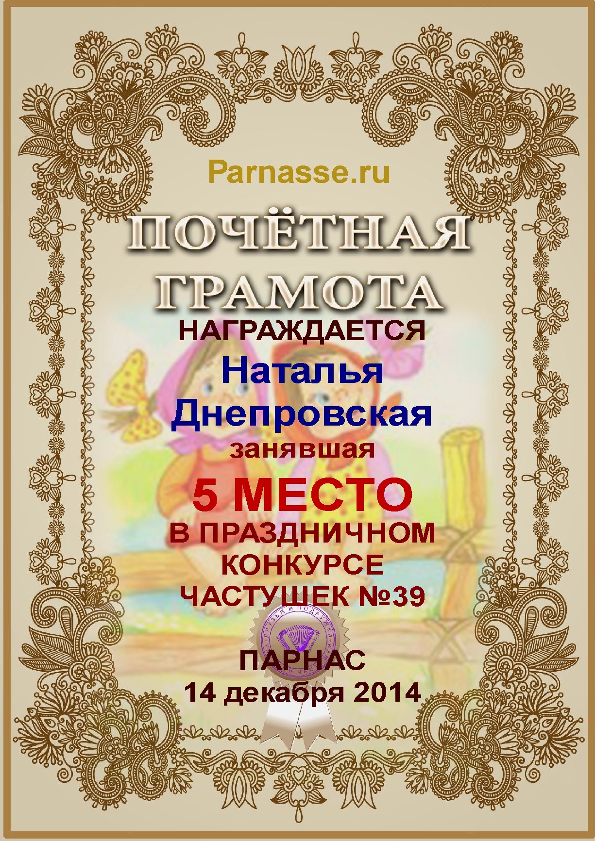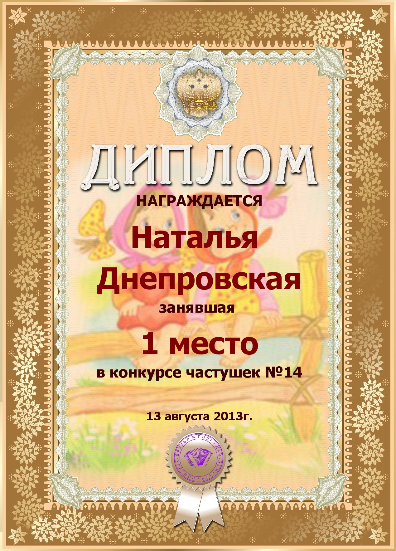 За второе место в конкурсе частушек №8++. Поздравляю, Наталья!)