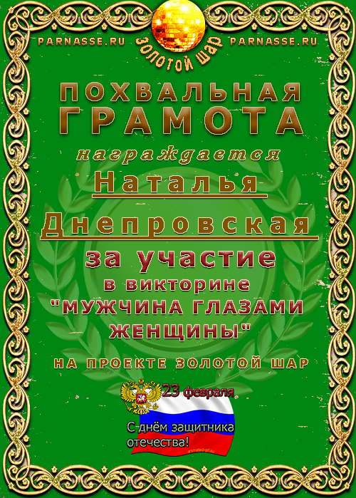 Похвальная грамота за участие в викторине "МУЖЧИНА ГЛАЗАМИ ЖЕНЩИНЫ"