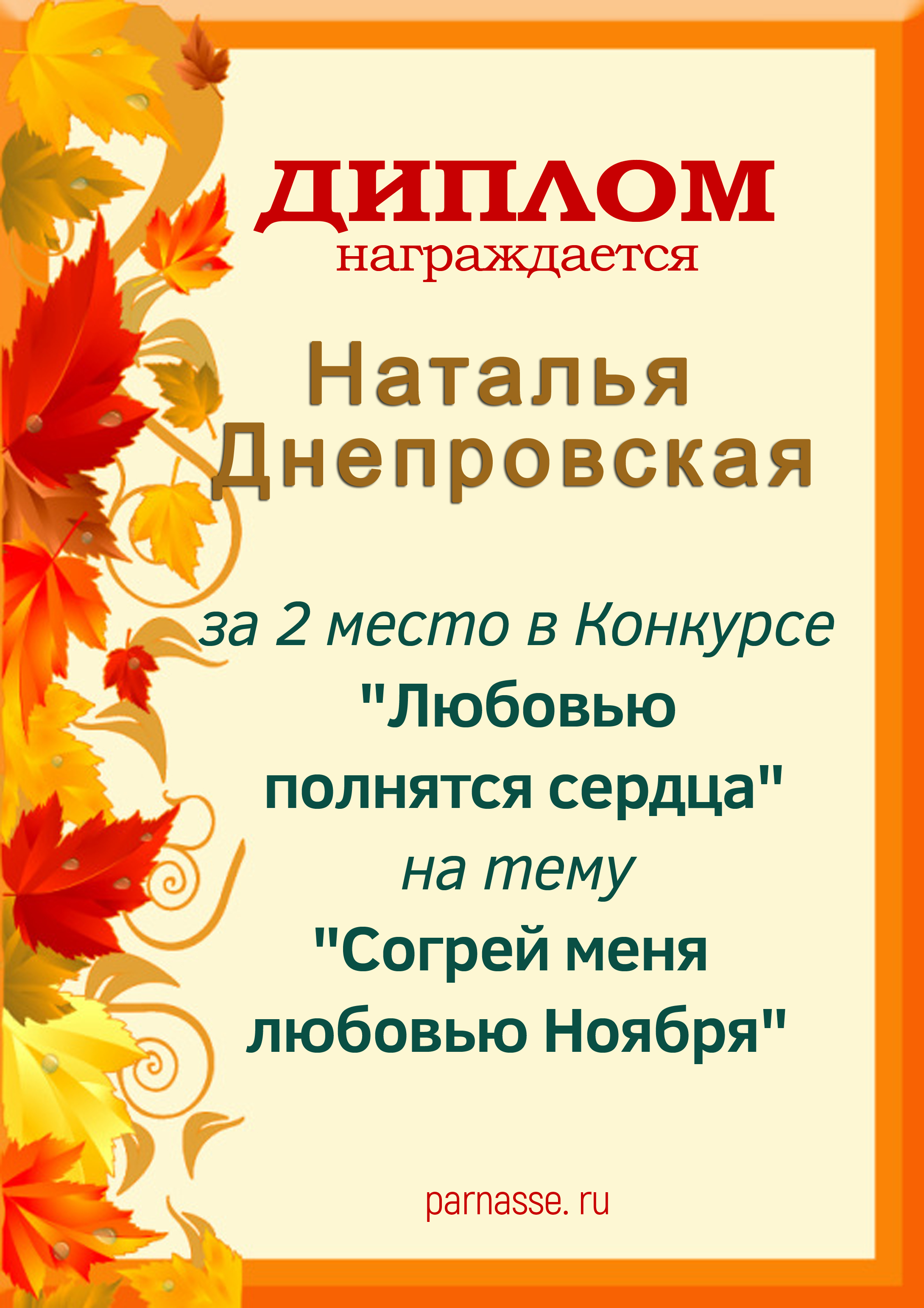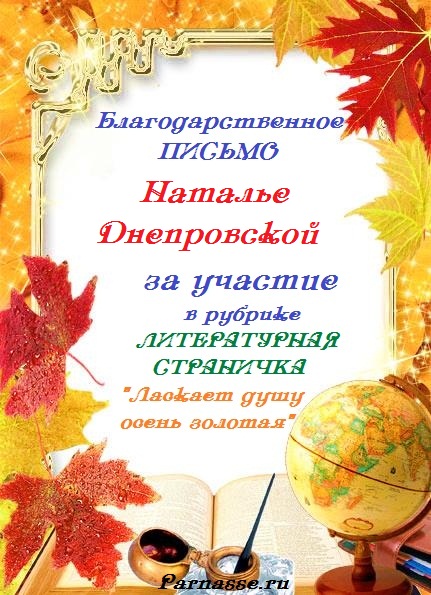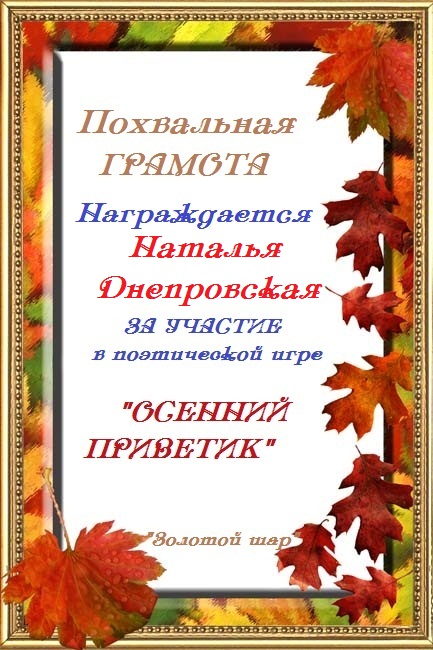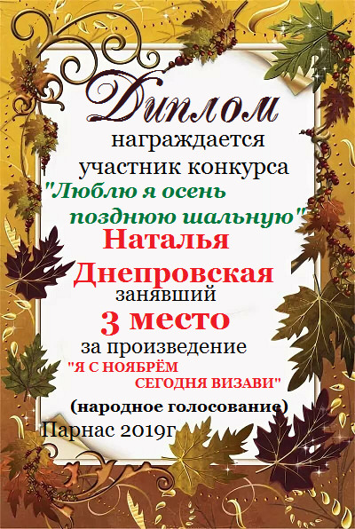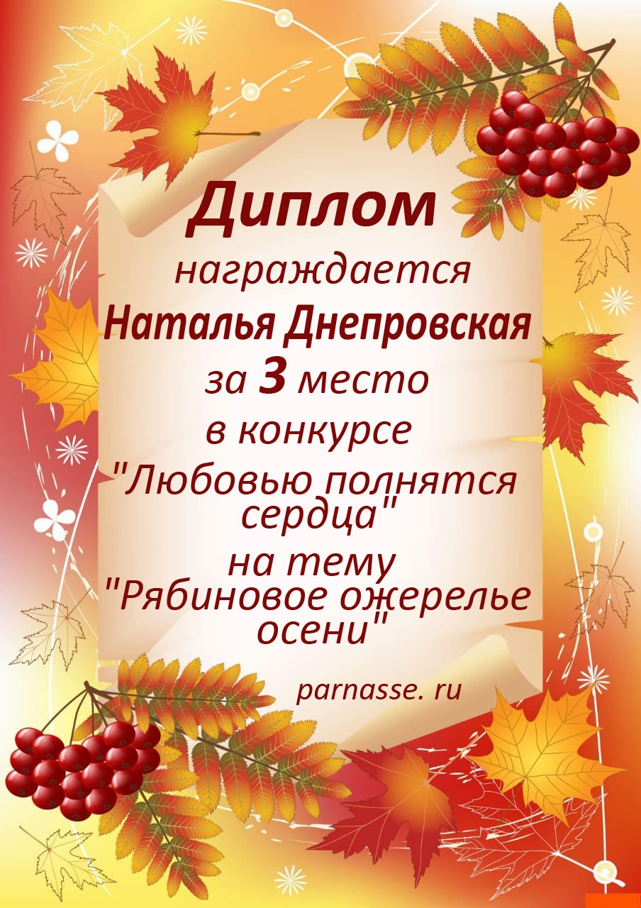 Наталья! Огромное спасибо за участие в номинации Музыкальное радио «В стихах и музыке я воспеваю осень» Желаем любви, счастья, удачи и новых творческих вдохновений!