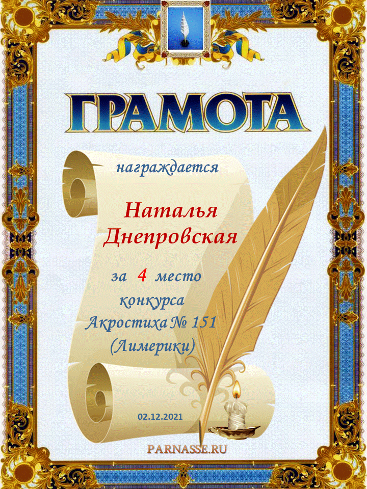 Похвальная грамота за 4 место и активное участие в конкурсе лимериков № 71+ (03.09.2015 г.)