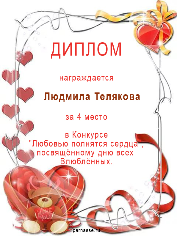 Поздравляю! 4 место в Конкурсе "Любовью полнятся сердца", посвящённому дню всех влюблённых!